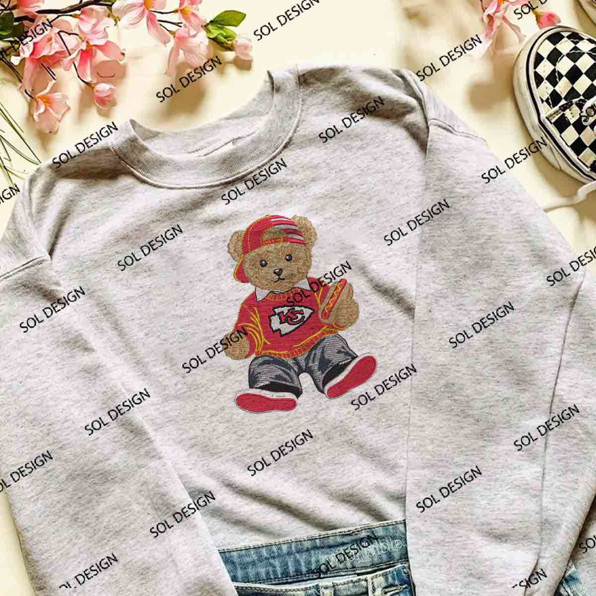 Kansas City Chiefs Team Teddy Bear Holding Hotdog Logo Embroidery Designs, NFL Kansas City Chiefs Embroidery Files, NFL Chiefs Logo Embroidery, National Football League Machine Embroidery Design, Cute Teddy Bear Sport Designs, Digital Do