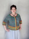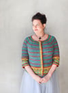 This is a pattern for a top down cropped cardigan with a circular yoke 3/4 length sleeves, worked in the round and with a bit of short row shaping at the neck, a steek, and using the stranded colourwork technique.