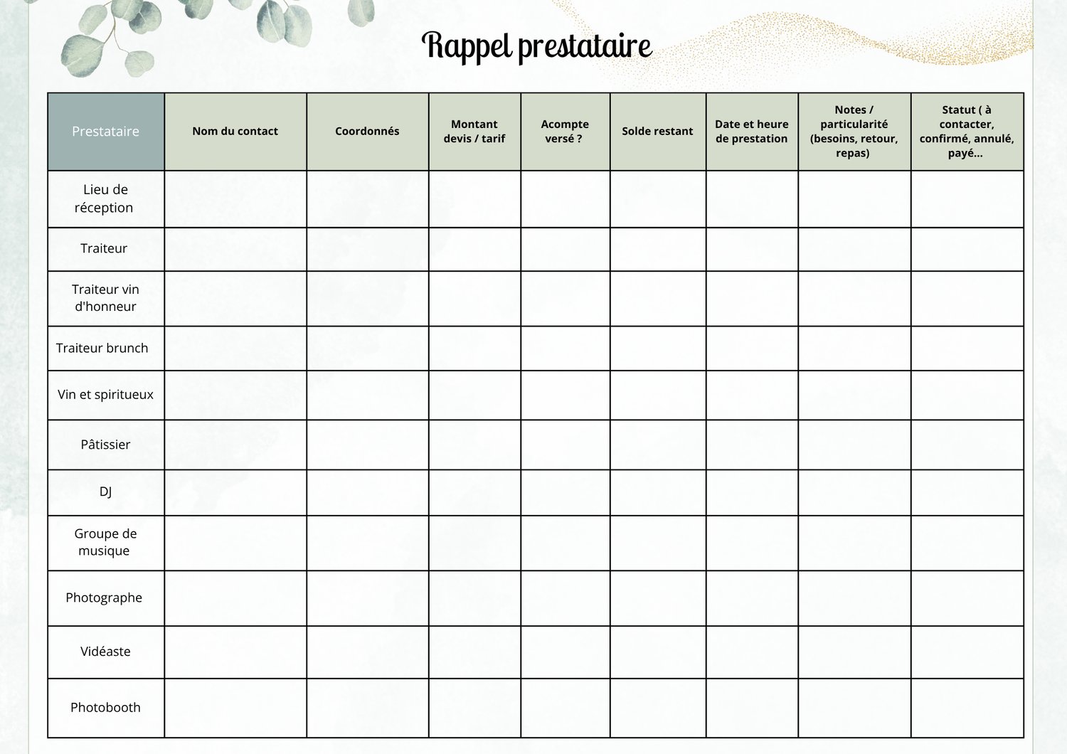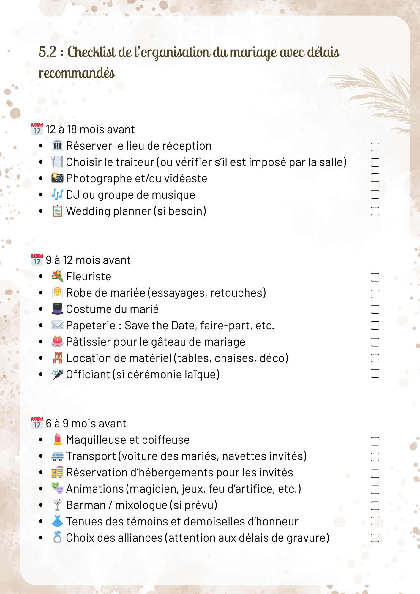 ✅ Des tableaux Excel prêts à l’emploi (budget, prestataires, invités…) et en PDF