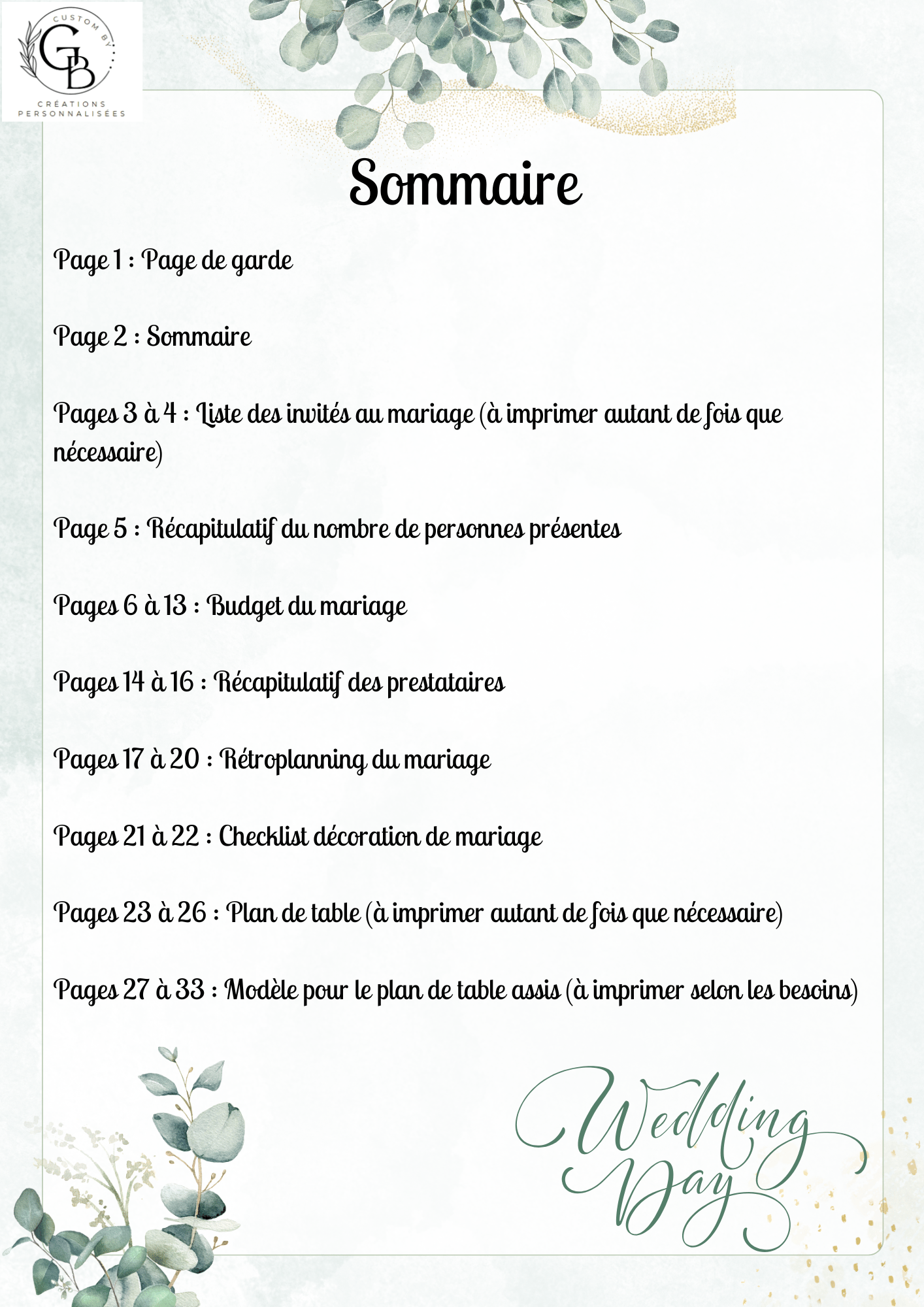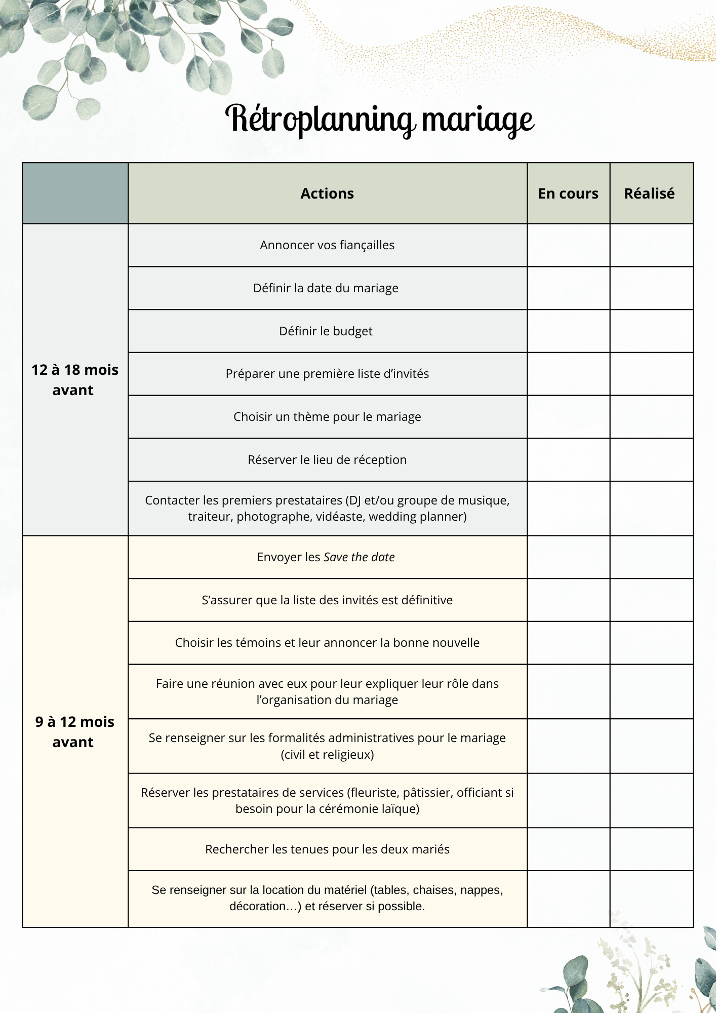Bonus : fichiers Excel et PDF à compléter : retro-planning, check-list à cocher, plan de table, budget, prestataire..