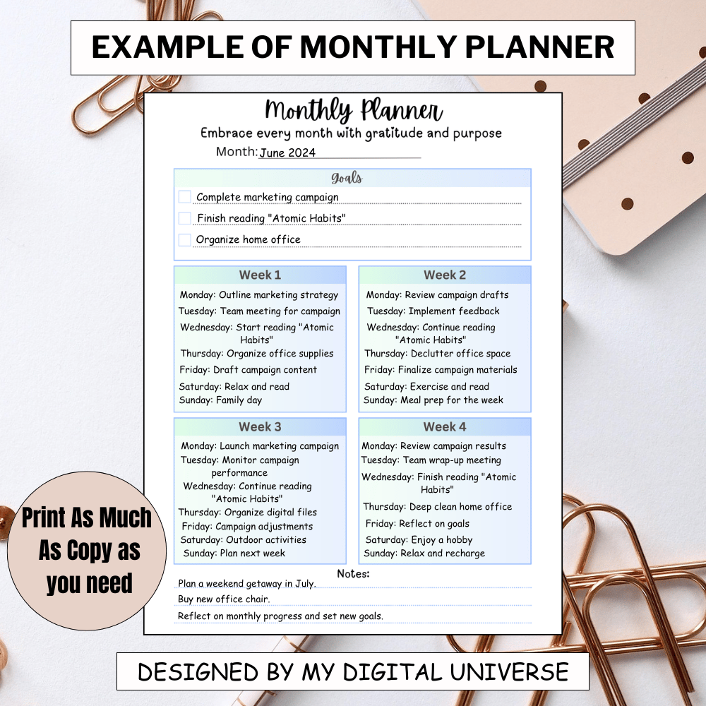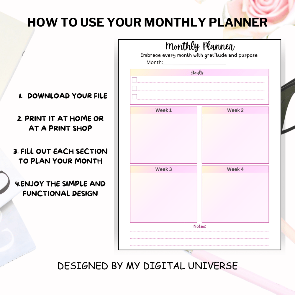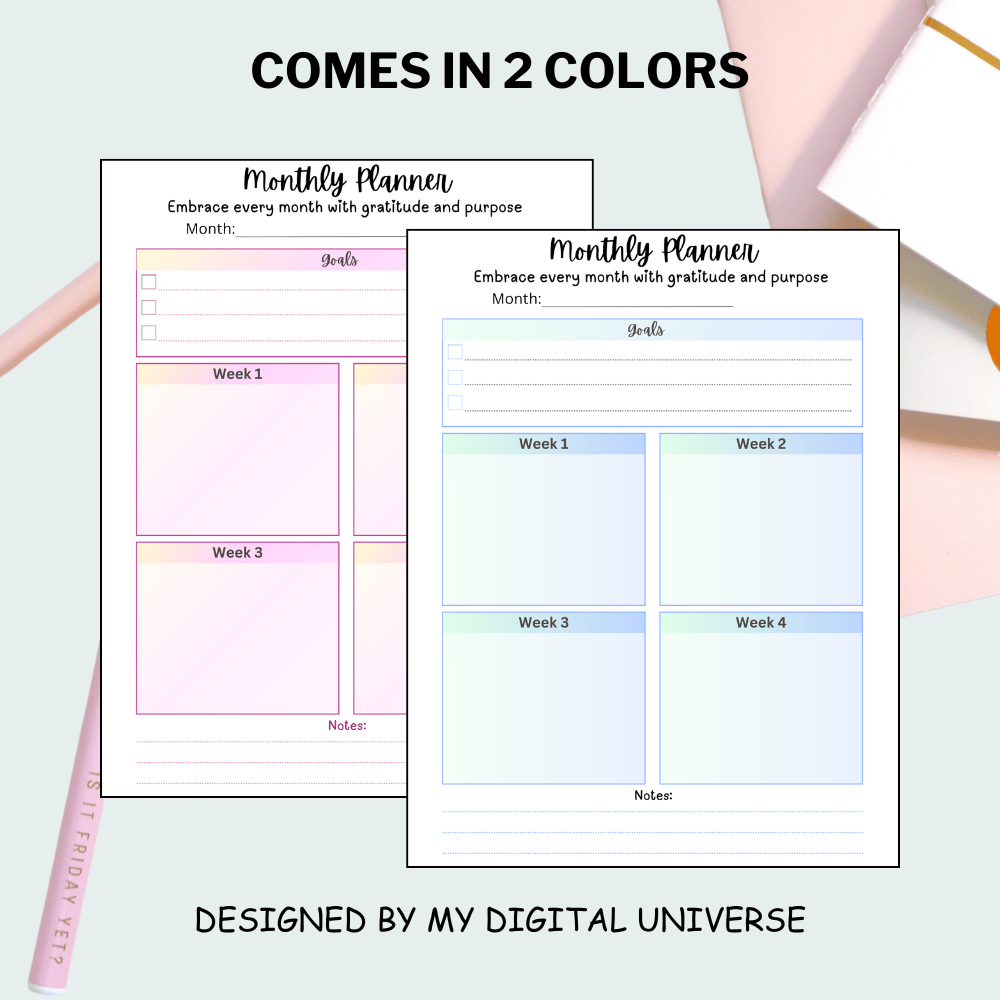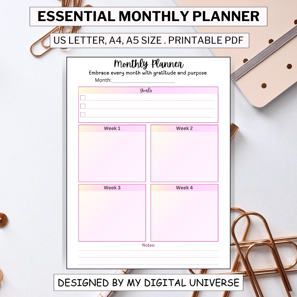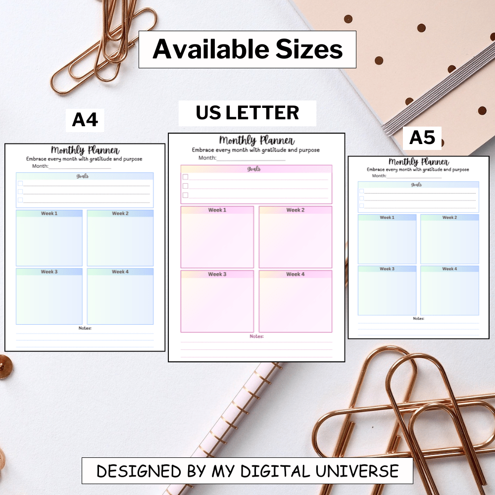 Monthly Planner Printable, Monthly Digital Planner, Goal Setting, Weekly Breakdown, Schedule Organizer, Notes Section, Undated Planner, US Letter, A4, A5, Multi-Color Options, PDF Digital Planner
