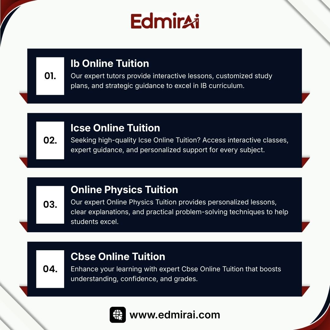 Enhance your learning with expert Cbse Online Tuition that boosts understanding, confidence, and grades. Experience interactive lessons, personalized guidance, and comprehensive study materials tailored to help you excel in exams. Perfect for students looking for flexible schedules and result-oriented support. Join Edmirai Private Limited and take your academic performance to the next level with proven strategies and expert teachers guiding every step!