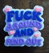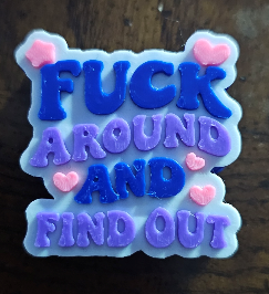 - Bold Phrase: “F*ck Around and Find Out” in bright purple + pink with paw-like heart accents