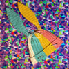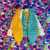 Inspired by marshmallows and Candyland, this design features bright blue, coral pink, yellow, and white stripes.