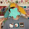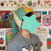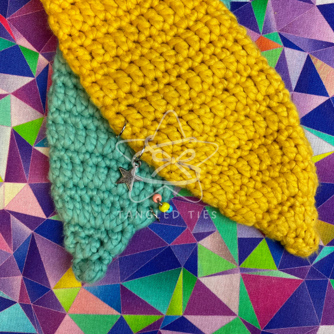 Crochet bunny ear beanie with safety pin + jumpring + beaded accessories, and simple bows tied on the ears.