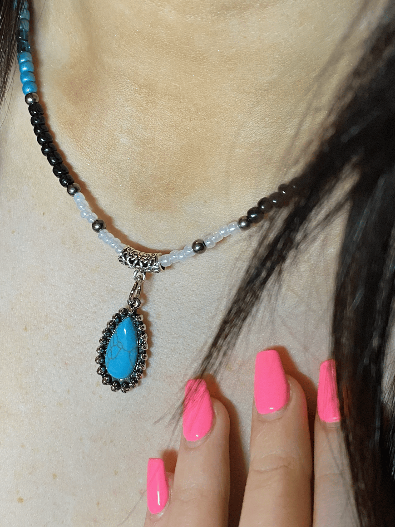 This handmade turquoise beaded choker necklace is a perfect blend of modern minimalism and Southwestern charm. Designed with delicate turquoise, black, and white seed beads, the necklace features a striking teardrop turquoise-style pendant framed in an antique silver-tone setting for a bold yet wearable statement.