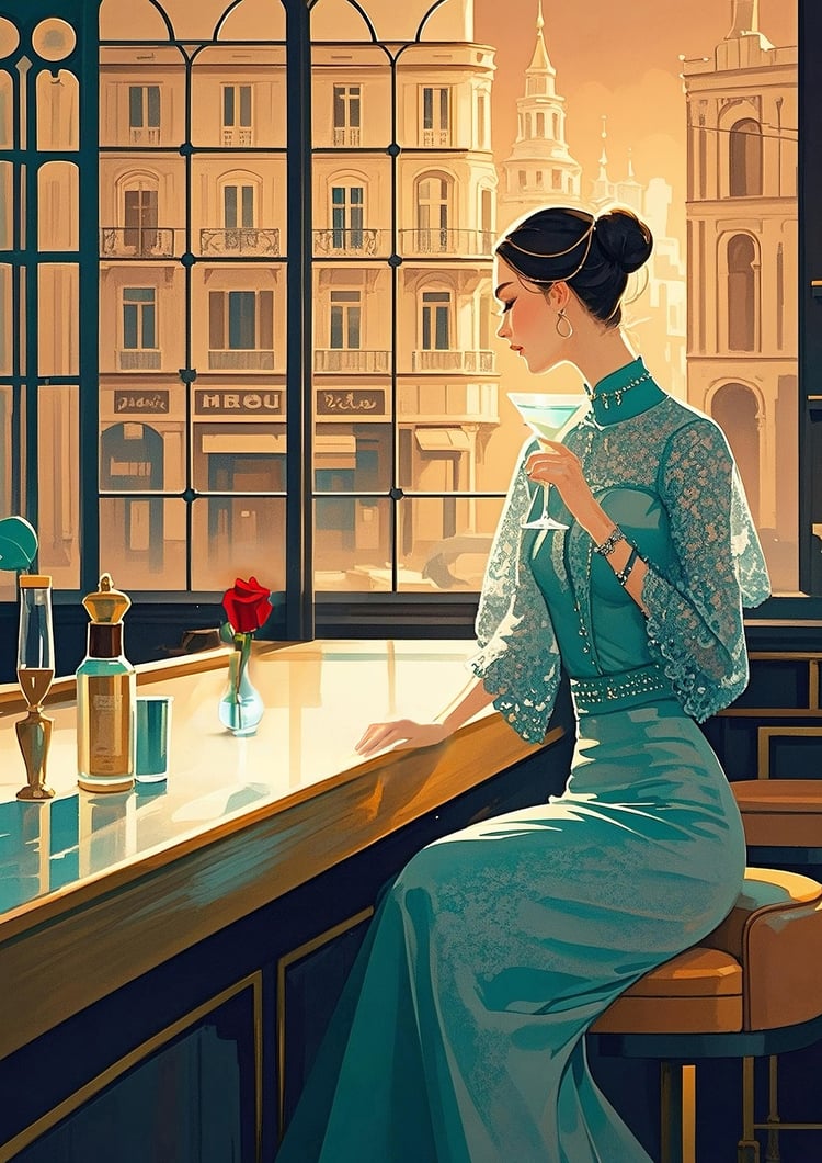 The woman’s posture and profile evoke the charm of classical portraiture, while also hinting at a narrative—perhaps a quiet moment of reflection in a luxurious café. The detailed cityscape outside the window adds depth, transporting the viewer to a serene European afternoon.