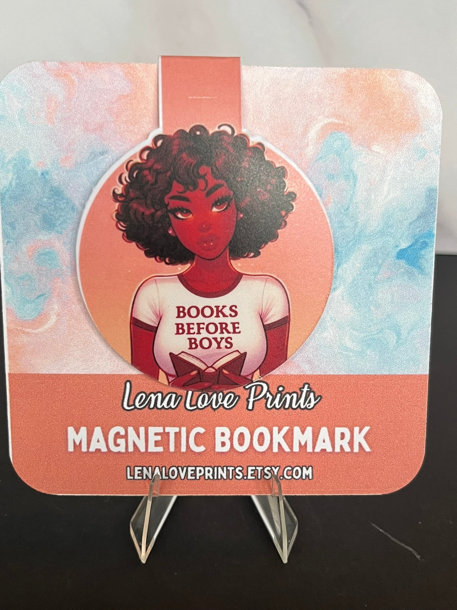 This “Books Before Boys” Magnetic Bookmark is a bold celebration of confidence, beauty, and a love of reading. Featuring a stunning illustration of a stylish Black woman with natural curls and a confident gaze, it delivers the perfect message for independent readers who know their worth. Made from sturdy cardstock and strong magnets, this bookmark holds your page securely without slipping or tearing — the perfect mix of art and attitude.