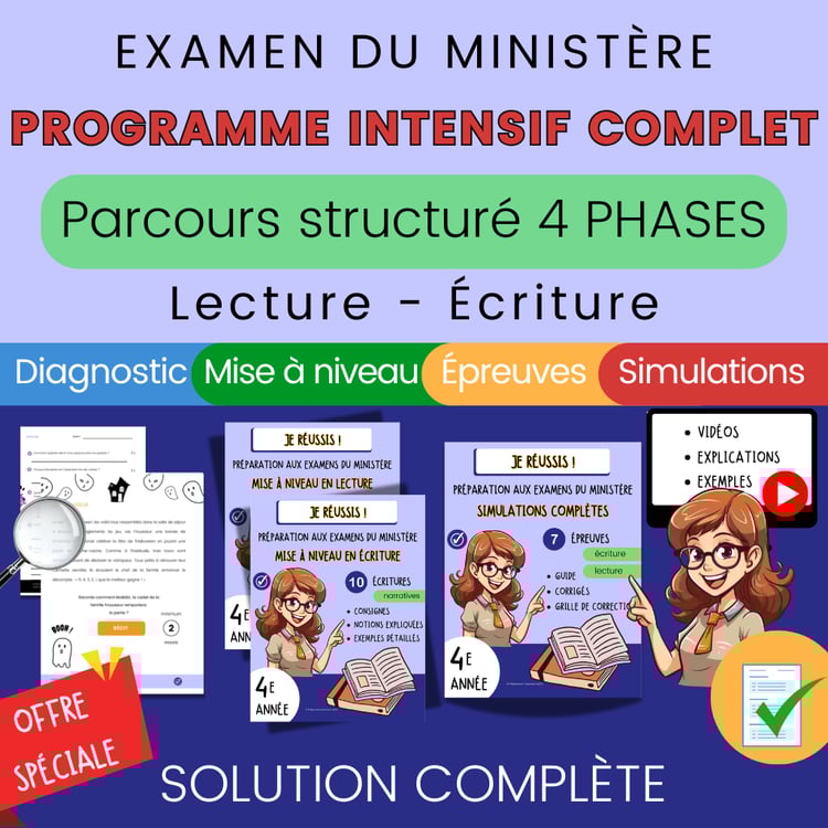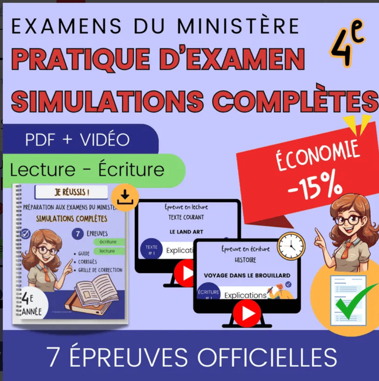 Préparez vos élèves de 4e année aux épreuves du ministère grâce à des simulations réalistes en lecture et en écriture, entièrement corrigées et prêtes à imprimer.