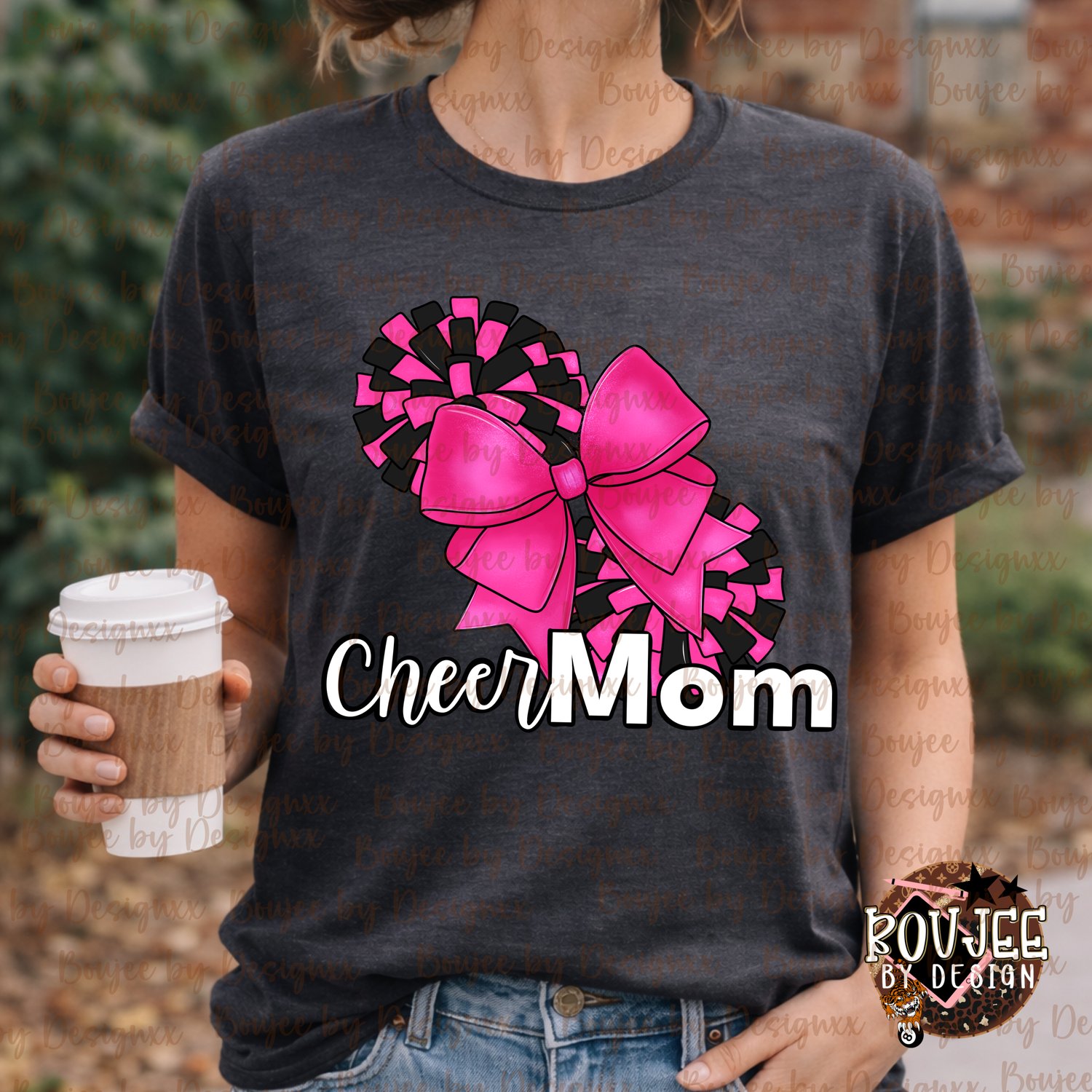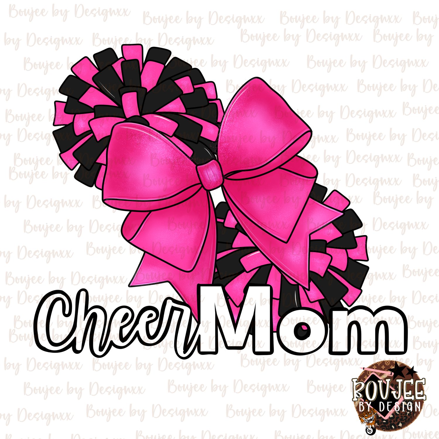 This trendy cheer mom design features bold pink and black pom poms with a boutique-style bow – perfect for creating custom shirts, tumblers, and more!
