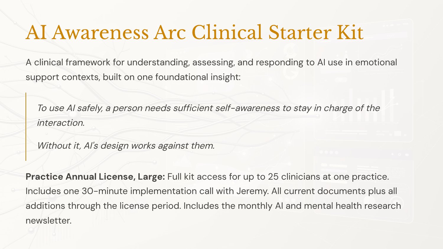 - Practice Annual License, Large: $897 Full kit access for up to 25 clinicians at one practice. Includes one 30-minute implementation call with Jeremy. All current documents plus all additions through the license period. Includes the monthly AI and mental health research newsletter.