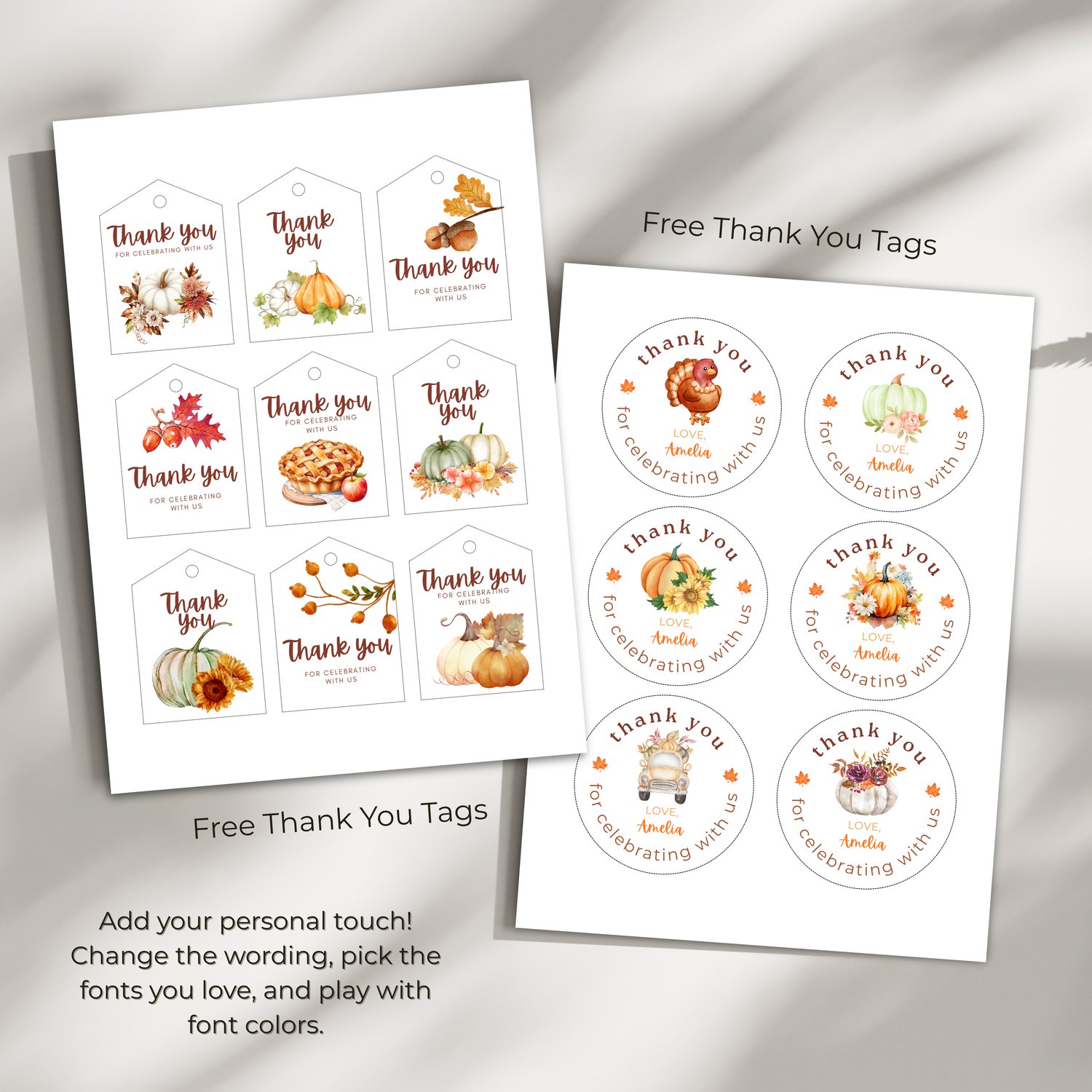 - Free printable thank-you tags (round and gift-tag formats)