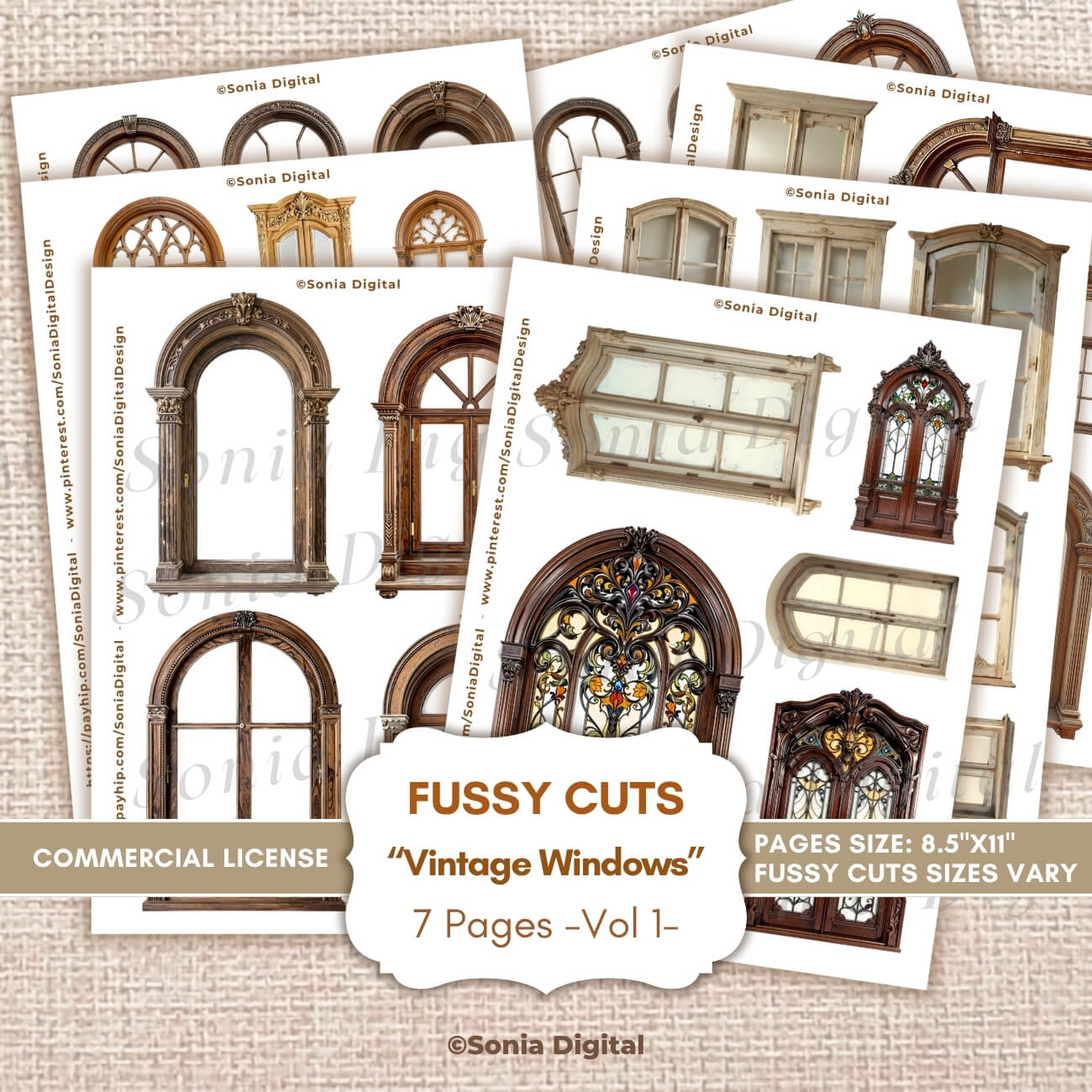7 printable Fussy Cuts pages, “Vintage Windows” Collection (Vol 1), for Scrapbooking and Junk Journal creations. Pages are Letter sized (8.5”x11”). Commercial use license included*.