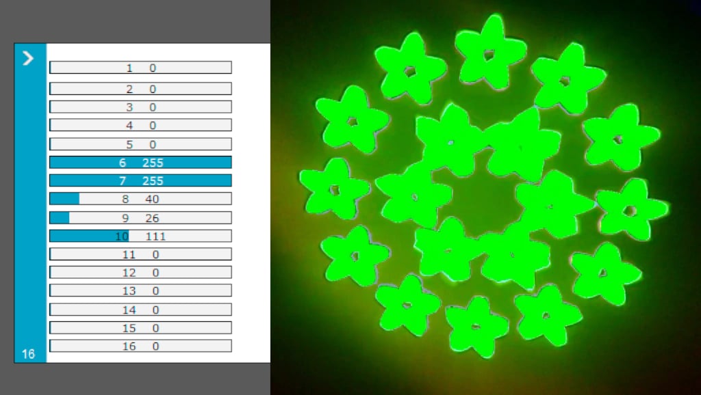 * En el modo de 15CH Verifique, con un Fixture de pruebas (click), que coincidan estos canales: 6 Dimmer, 7 Strobo/Shutter, 10 Prisma, 8 en el valor 40 = Color Verde, 9 en el valor 26 = Gobo de la cuarta foto, 14 Aro Led.
