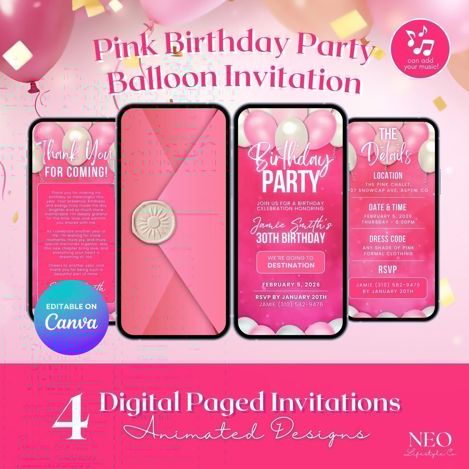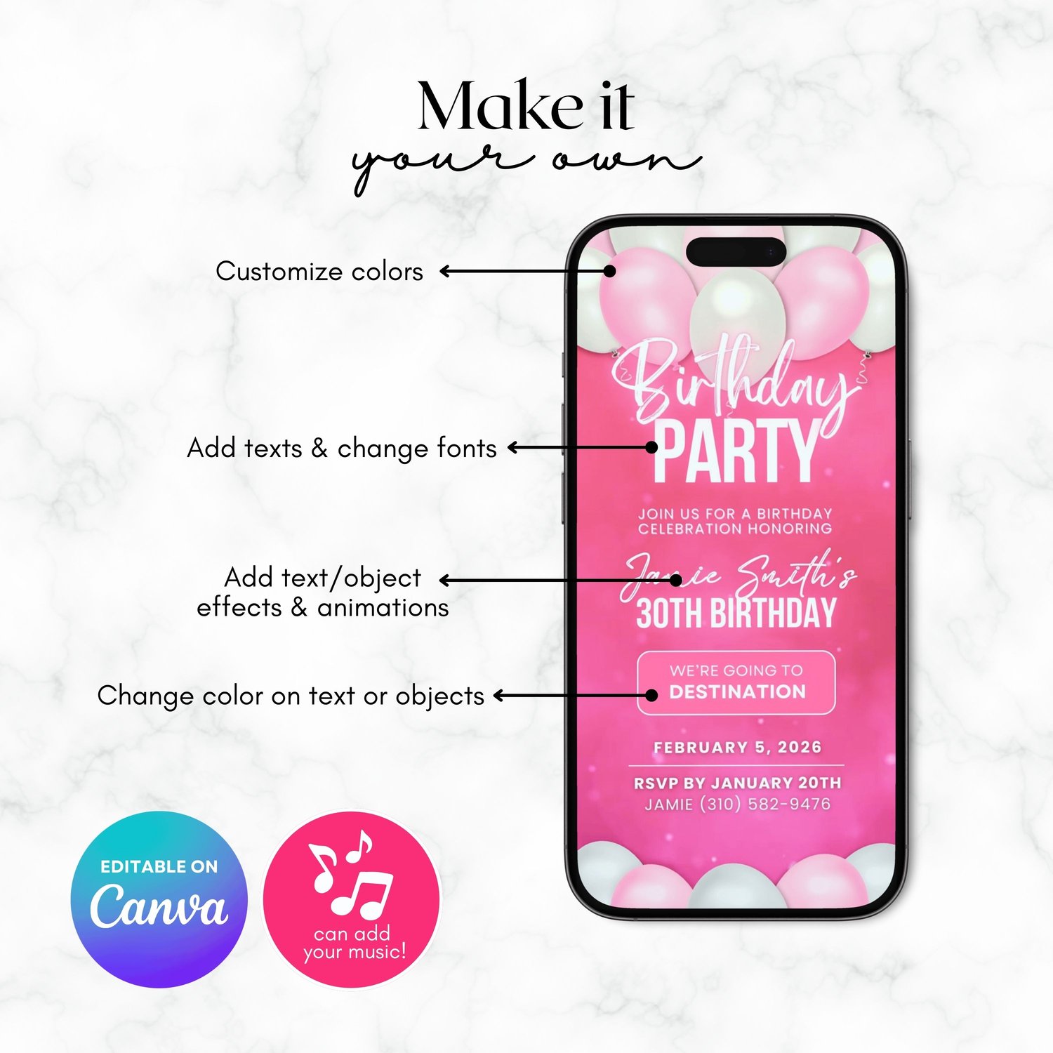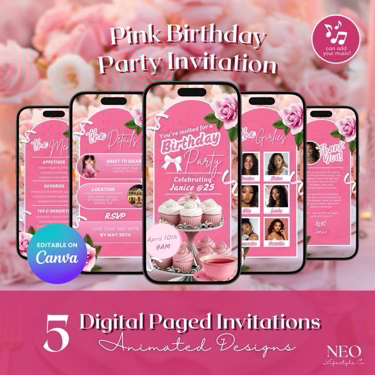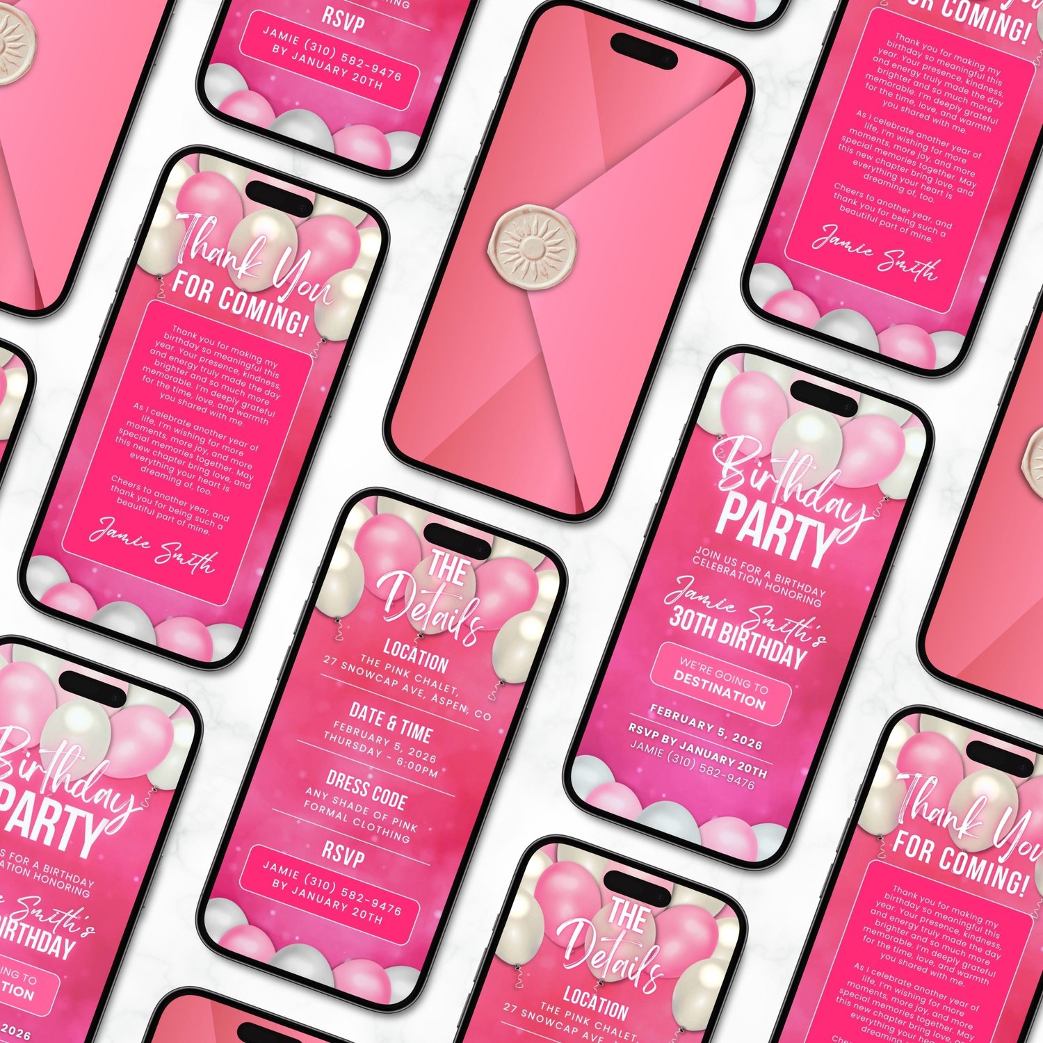 Easily edit your invitation in Canva (Free or Pro) โ customize text, colors, names, and details to fit your party perfectly. No design experience needed! After editing, download your animated MP4 invite and send it instantly through Messenger, WhatsApp, Viber, Instagram, TikTok, email, or text.