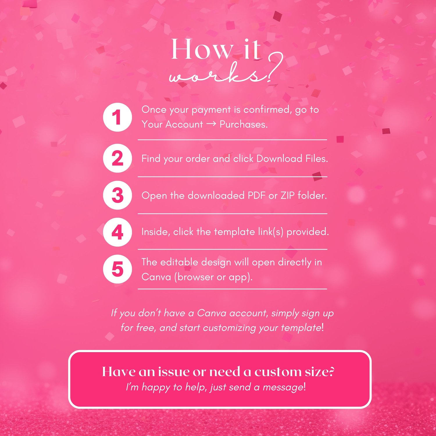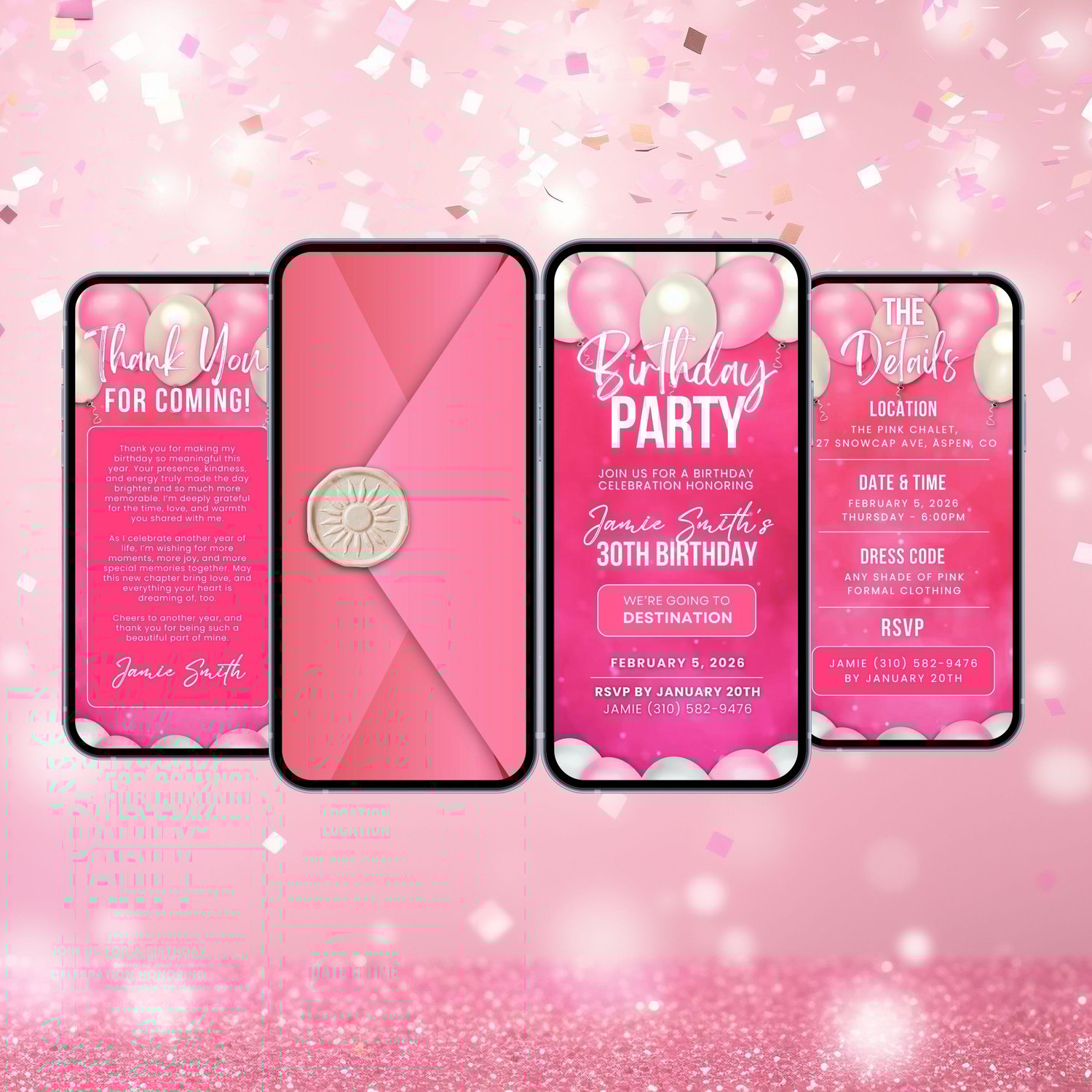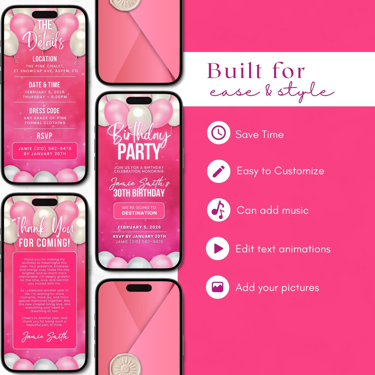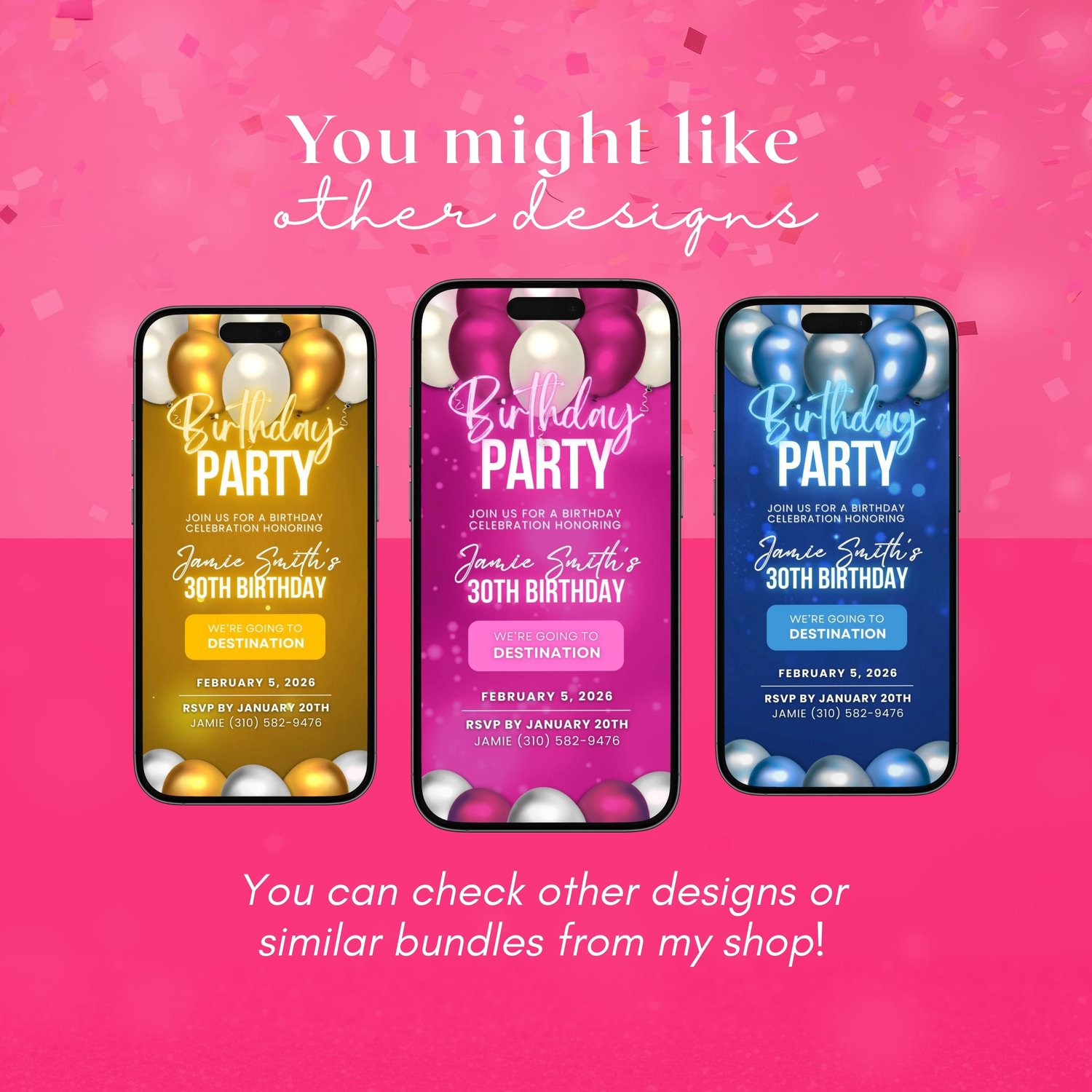 Easily edit your invitation in Canva (Free or Pro) โ customize text, colors, names, and details to fit your party perfectly. No design experience needed! After editing, download your animated MP4 invite and send it instantly through Messenger, WhatsApp, Viber, Instagram, TikTok, email, or text.