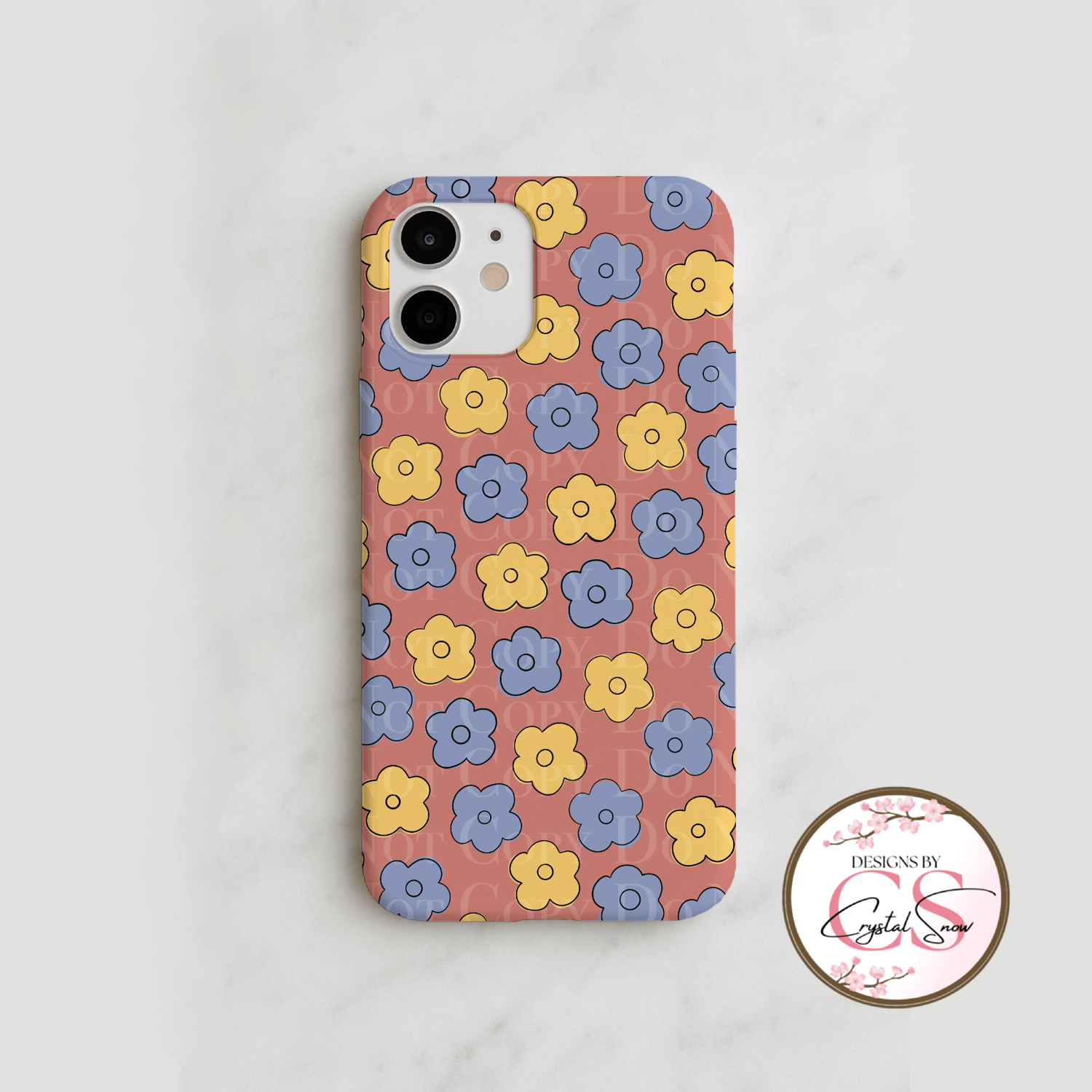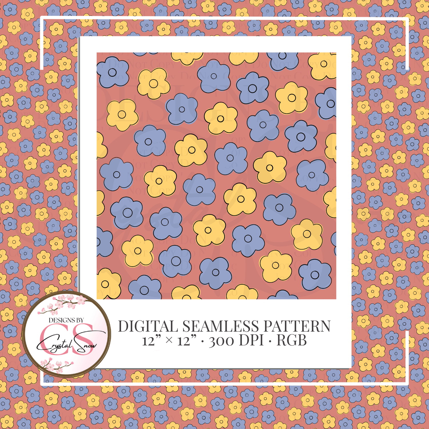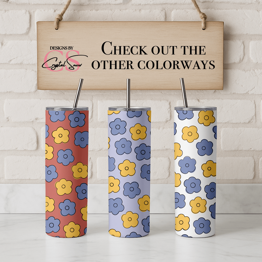 This hand-drawn retro daisy seamless pattern features soft blue and mustard flowers layered over a warm coral background. Designed in a clean, modern 70s style, this repeat tile is perfect for fabric printing, tumblers, scrapbook paper, wrapping paper, planners, and sublimation projects.