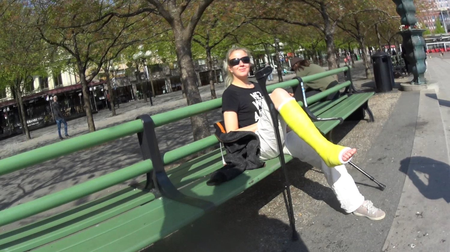 Alva is crutching around in Stockholm, Sweden with her yellow short leg cast.She crutch first down to a big fountain and after that up the steps again to a bench.She puts her casted leg up on a crutch so we can get a great closeup of her cast from differen angles.