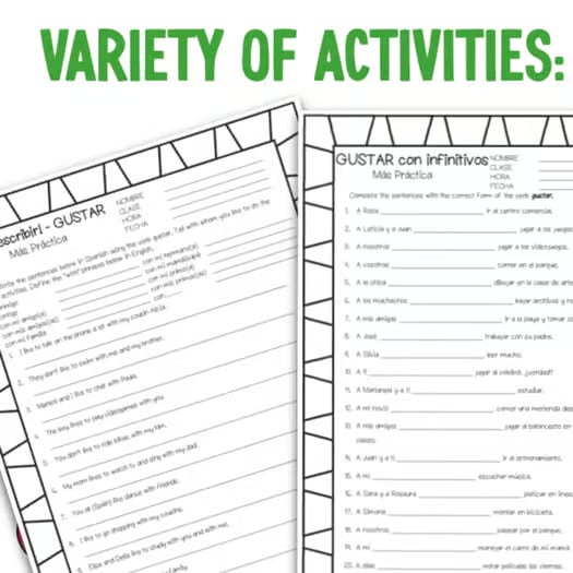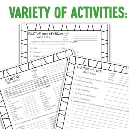 Gustar with Infinitives and Nouns Worksheets Practice Activities Packet