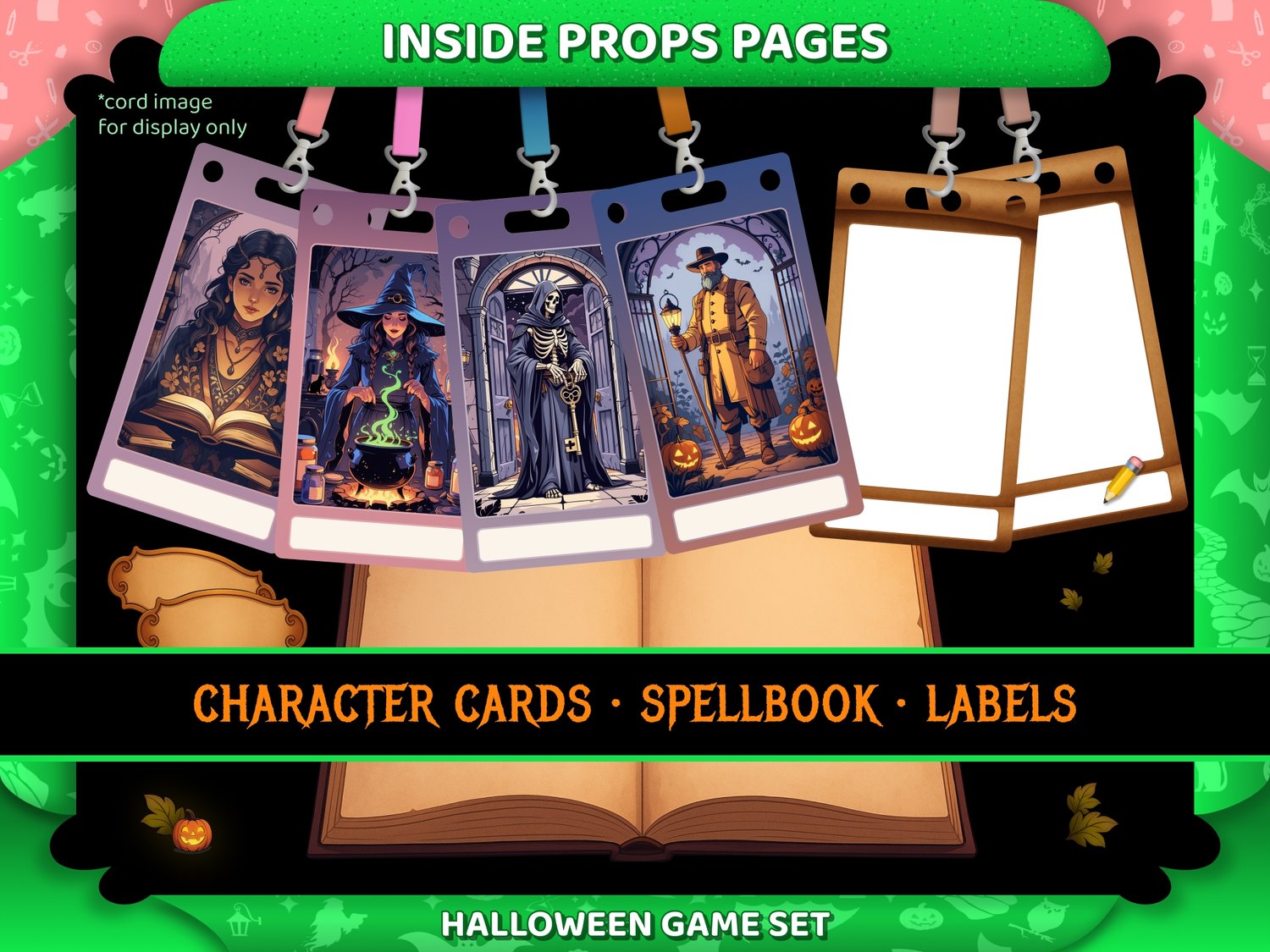 • 15 printable pages — Character cards, Spell book, Envelope blueprint, Labels, Posters, Certificate and decorative props;