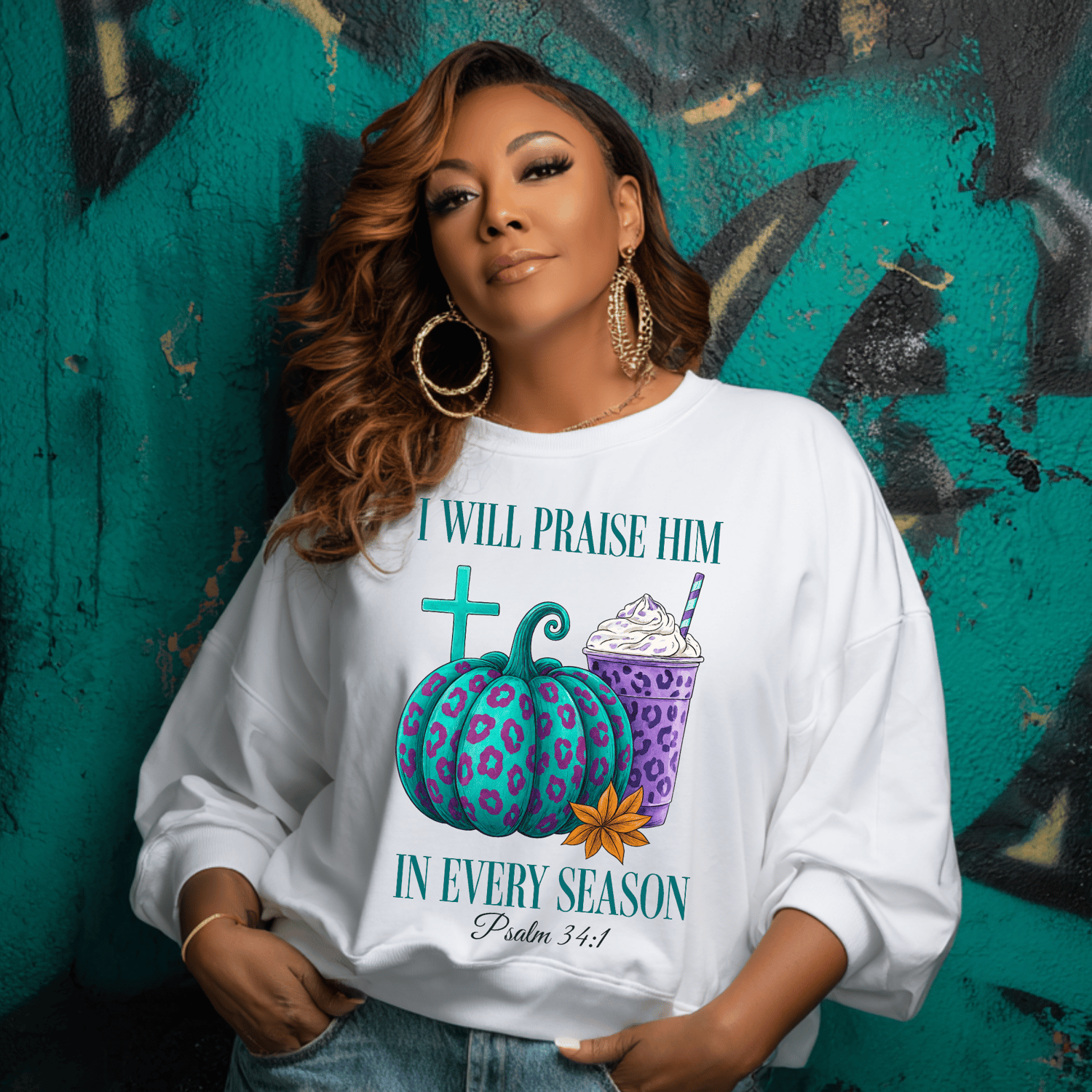 Celebrate your faith in every season with this beautiful Christian design inspired by Psalm 34:1. Featuring a leopard print pumpkin, a faith-filled cross, and cozy fall elements, this design is perfect for believers who praise God year-round — not just when things are easy.