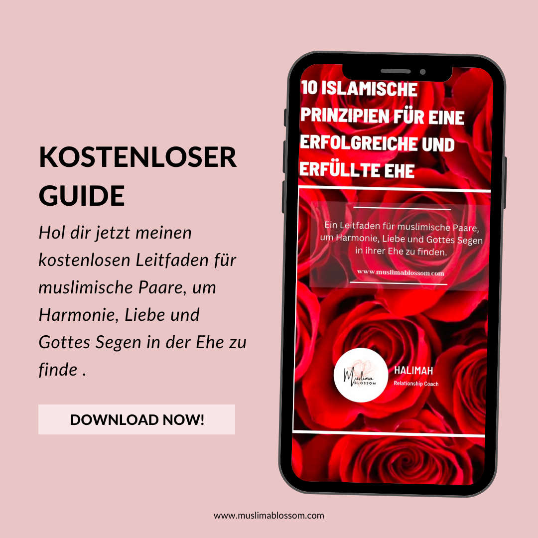 Möchtest du deine Ehe auf das nächste Level bringen und nach den Prinzipien leben, die Allah uns für eine erfüllte Beziehung gegeben hat? Dieser kostenlose Guide mit 10 islamischen Prinzipien für eine erfolgreiche und erfüllte Ehe gibt dir wertvolle Impulse und praktische Tipps, die dir helfen, deine Ehe nach den Lehren des Islam zu stärken.
