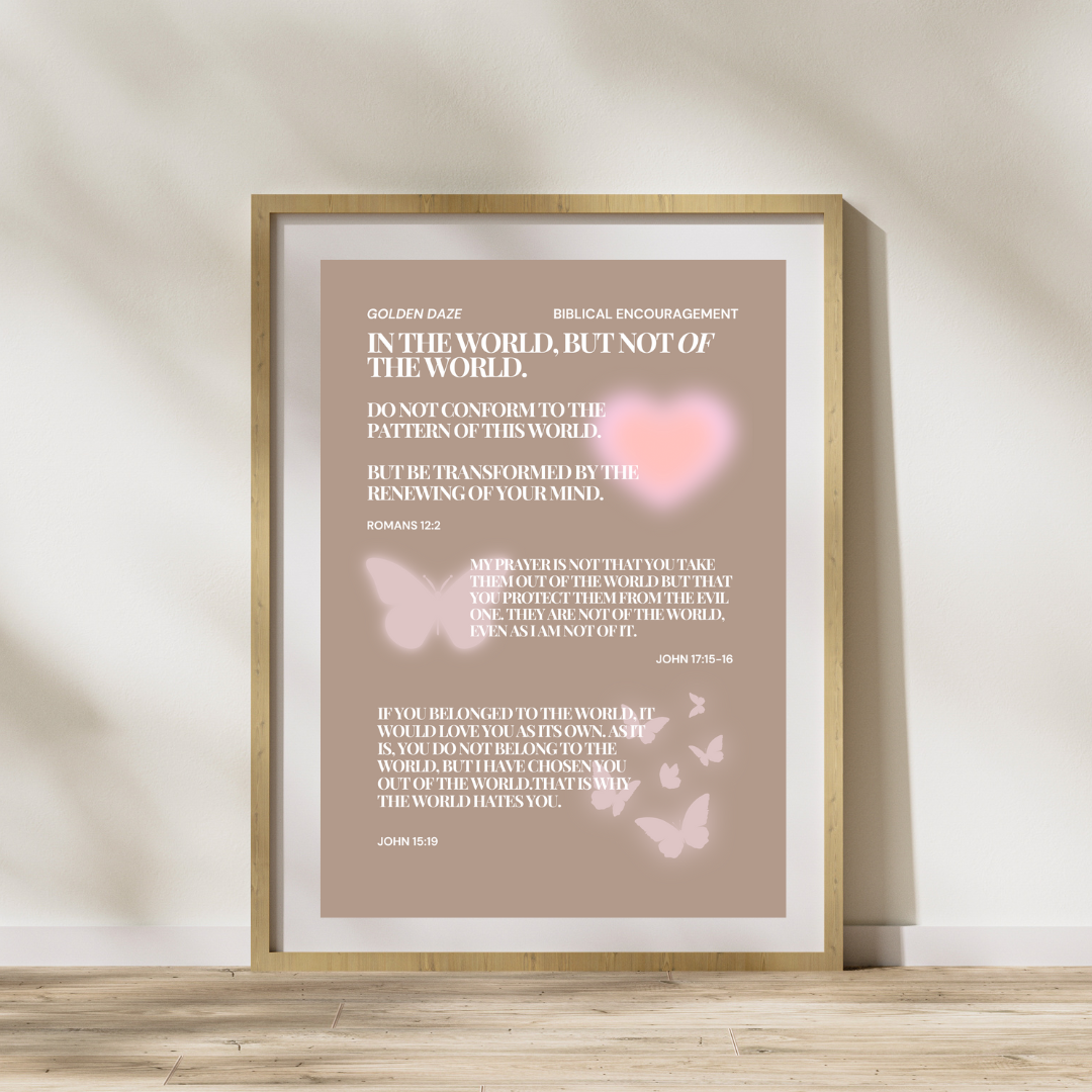 Y2K-style brown and pink "in the world, but not of the world" digital printable christian wall art