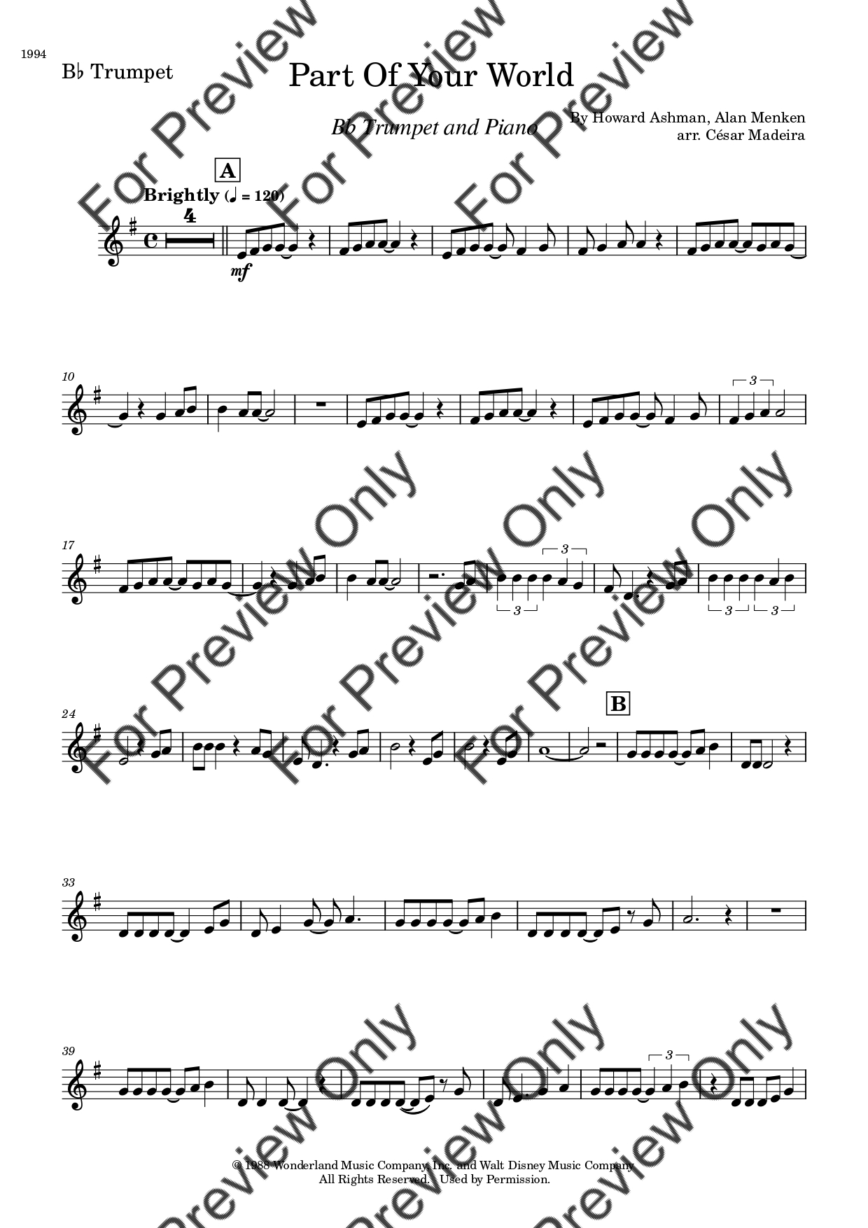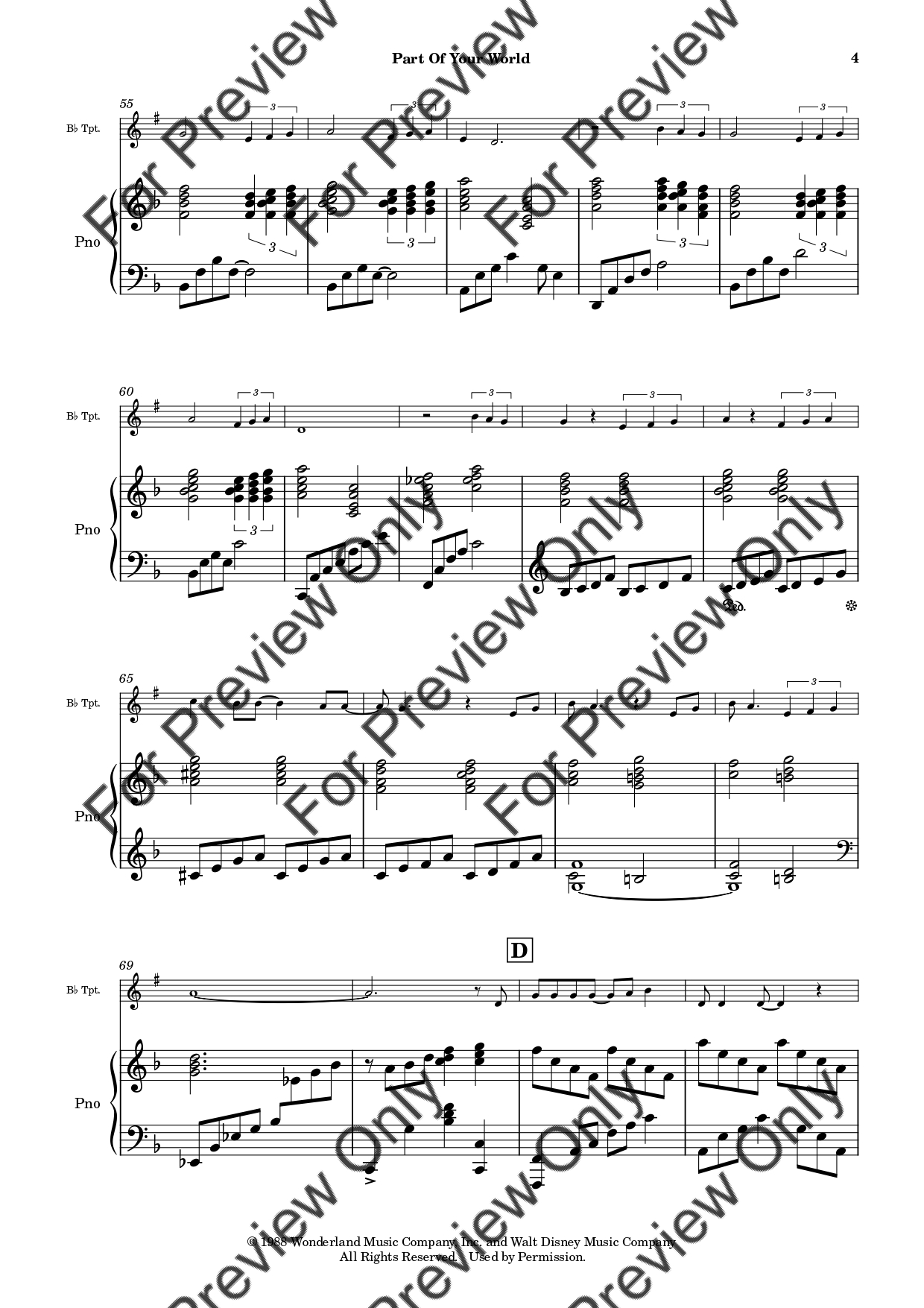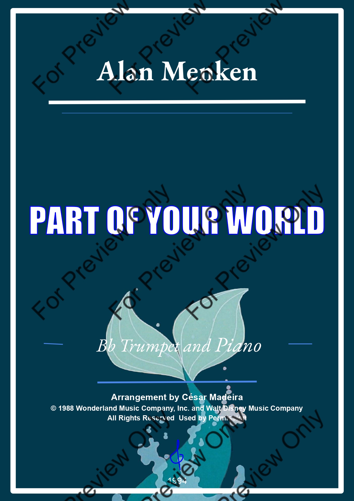 Part Of Your World from The Little Mermaid by Alan Menken. Arrangement for Bb Trumpet and Piano. With Full Score and Individual Parts. Have fun!