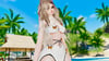 Wet shirt, Bikini, Pixie top, skirt and wedge heels.
