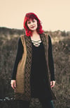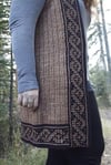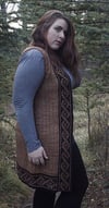 This sleeveless coat with A-line shaping is a fashionable layering piece that will suit a wide range of figures. A delightful border pattern sets off hem, front edges and collar; the body hem border is knit along with the body piece itself, while front border is picked up along the edges and knit sideways.