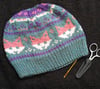 This hat is worked in the round from the bottom up using the stranded method for the colourwork section. The hat begins with rib, the stranded motif is worked, and then it is topped with a faux-fur pompom.