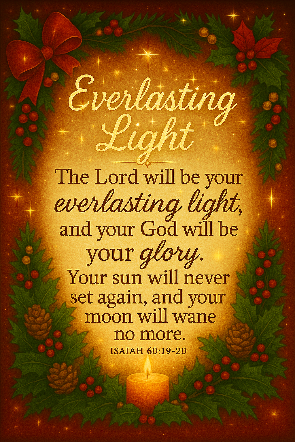 Celebrate the eternal brilliance of Godβs presence with this Christian wall art featuring Isaiah 60:19β20. A glowing candle surrounded by pinecones, holly, berries, and a red ribbon bow shines against a radiant red and gold background. This printable evokes divine glory, peace, and the promise of everlasting lightβperfect for Christmas scripture decor, ministry bundles, devotional gifts, and inspirational holiday printables.