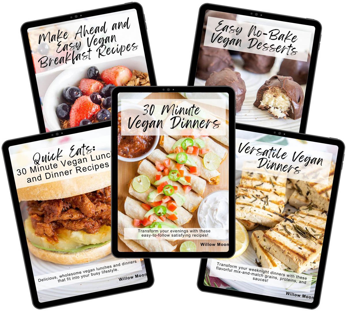 - 5 ebooks that include breakfast, lunch, dinner, and dessert recipes: Make-Ahead and Easy Vegan Breakfast Recipes, Quick Eats: 30 Minute Vegan Lunch and Dinner Recipes, 30 Minute Vegan Dinners, Versatile Vegan Dinners, and Easy No-Bake Vegan Desserts.