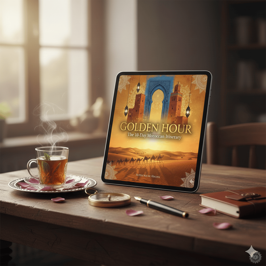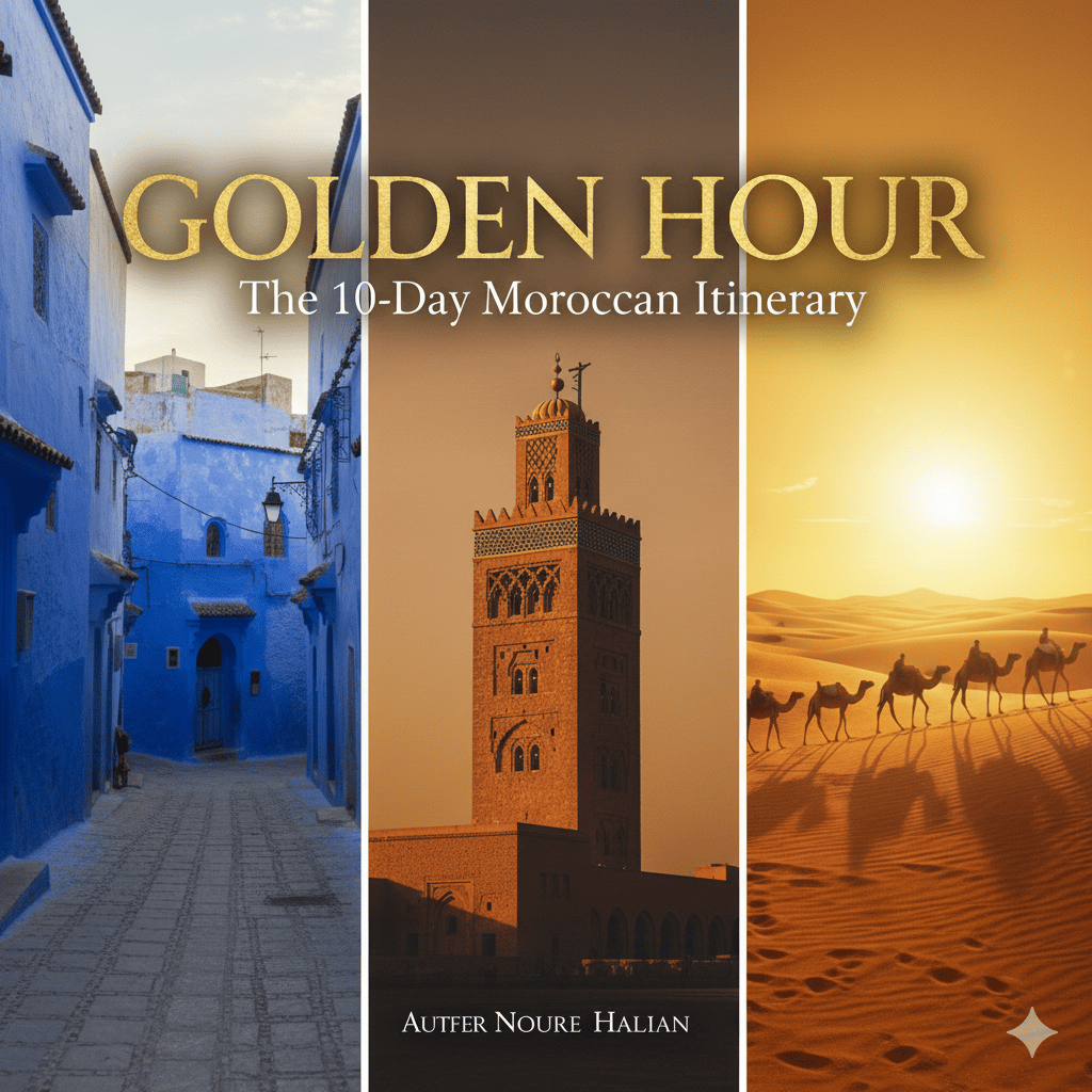 Embark on the journey of a lifetime with "GOLDEN HOUR," the most comprehensive and visually stunning guide to discovering the heart of Morocco. In just 10 days, this meticulously crafted itinerary takes you from the winding blue alleys of the north to the golden dunes of the deep Sahara, ensuring you capture every "Golden Hour" moment this exotic kingdom has to offer.