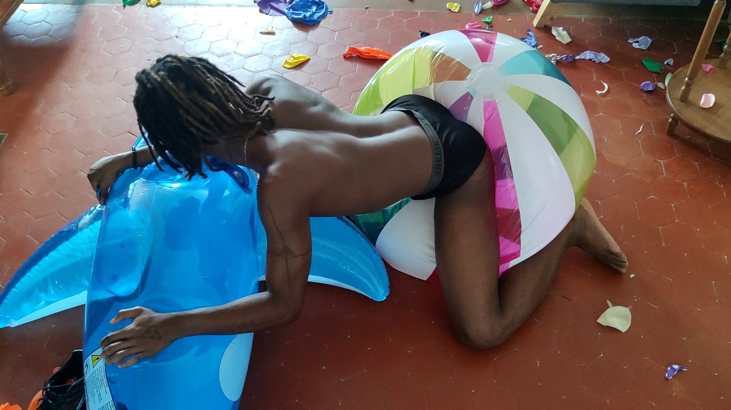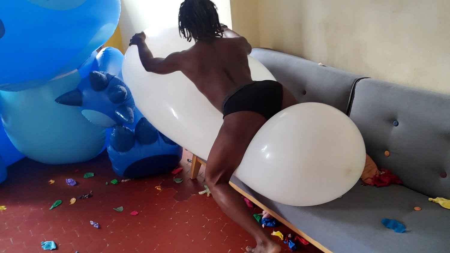 Christopher is a young black twink who have fun bursting balloons.