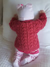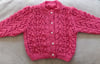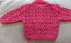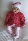 This 8ply baby’s jacket is worked in a beautiful lace stitch. It has a round neck, set in sleeves and rib bands.