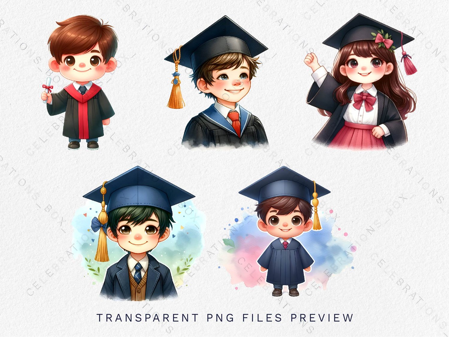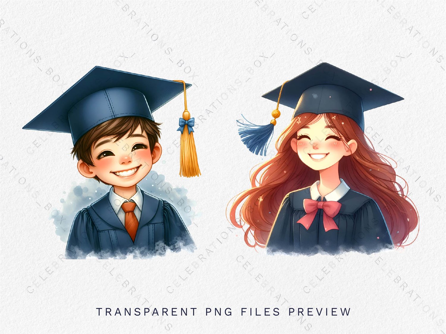 Our Watercolor Graduate Clipart collection features a diverse selection of Graduation-themed elements, including Graduation Caps, Diplomas, and Book clipart. Each illustration captures the spirit of success and represents the culmination of hard work and dedication.