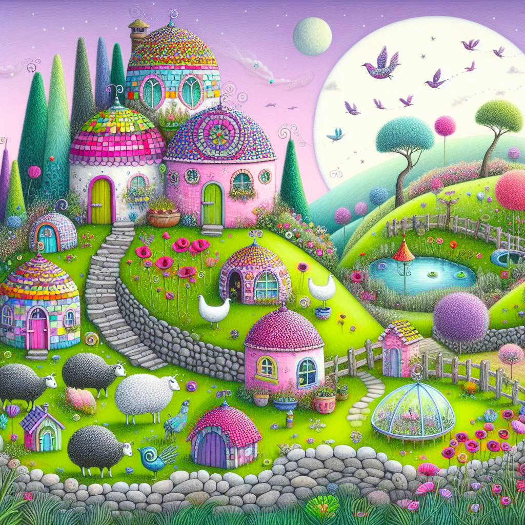 Quirky small half moon houses made of bright colourful tiny pink & blue bricks with mosaic glass tile roofs. A field with black curly sheep by a stone wall. Chickens & a fancy coup. There are poppies everywhere. A wishing well, pond & twisty trees, with glass bird houses & there are humming birds.