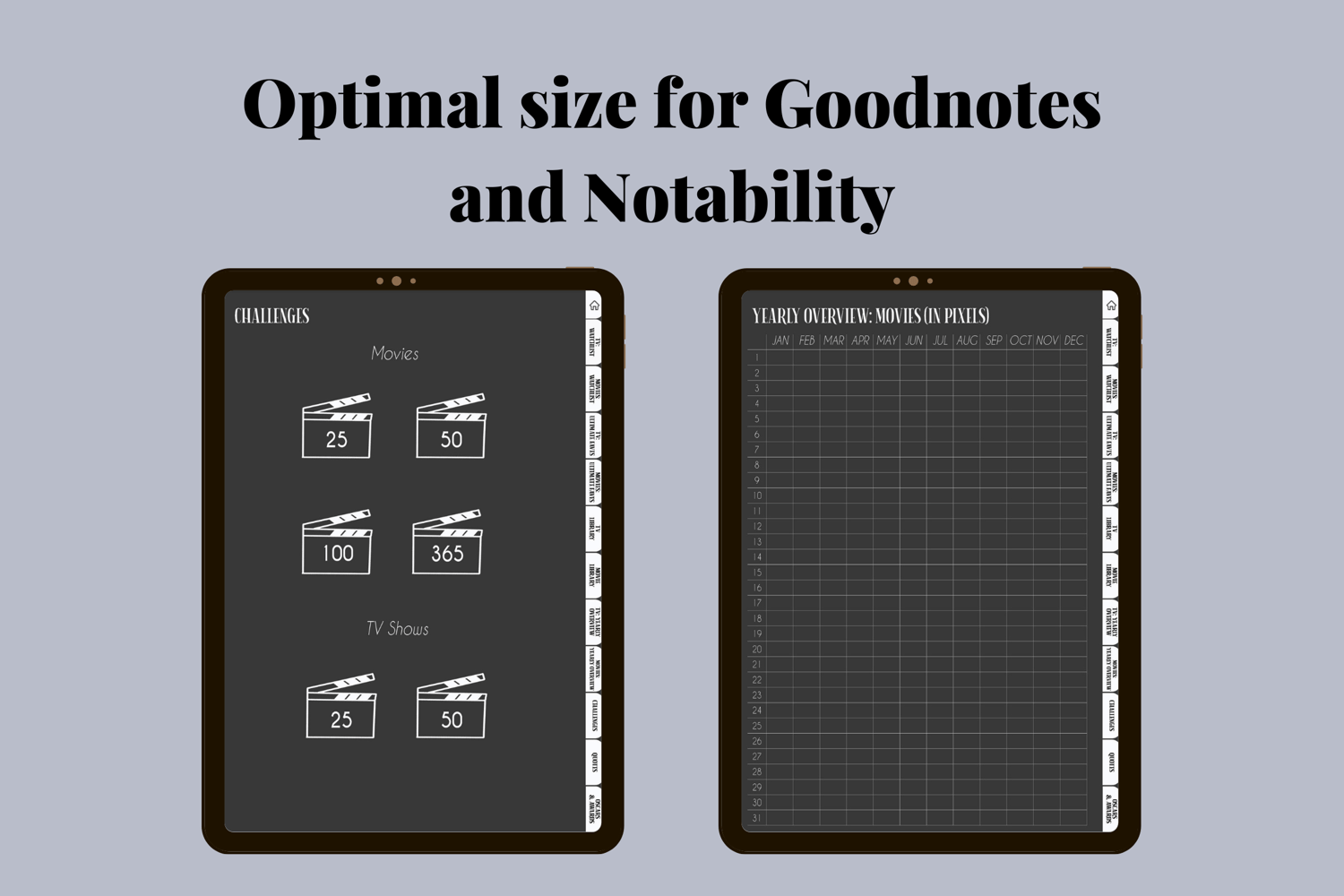 · Yearly Overview: Pick out your favorite media for each month! Furthermore, you have a “Year in Pixels” template to fill out the days in which you’ve seen a movie.