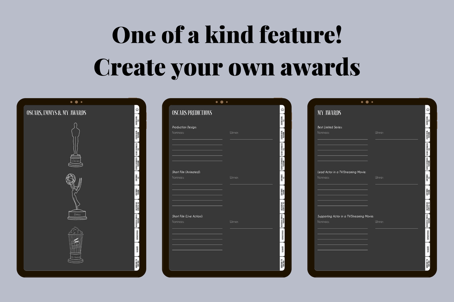 · Oscars, Emmys and My Awards: Each year, you can fill out the nominees for these remarkable awards and predict the winners. But that’s not all! Feel free to create your own awards ceremony by nominating your favorite media for the year (and pick the winners as well!).