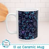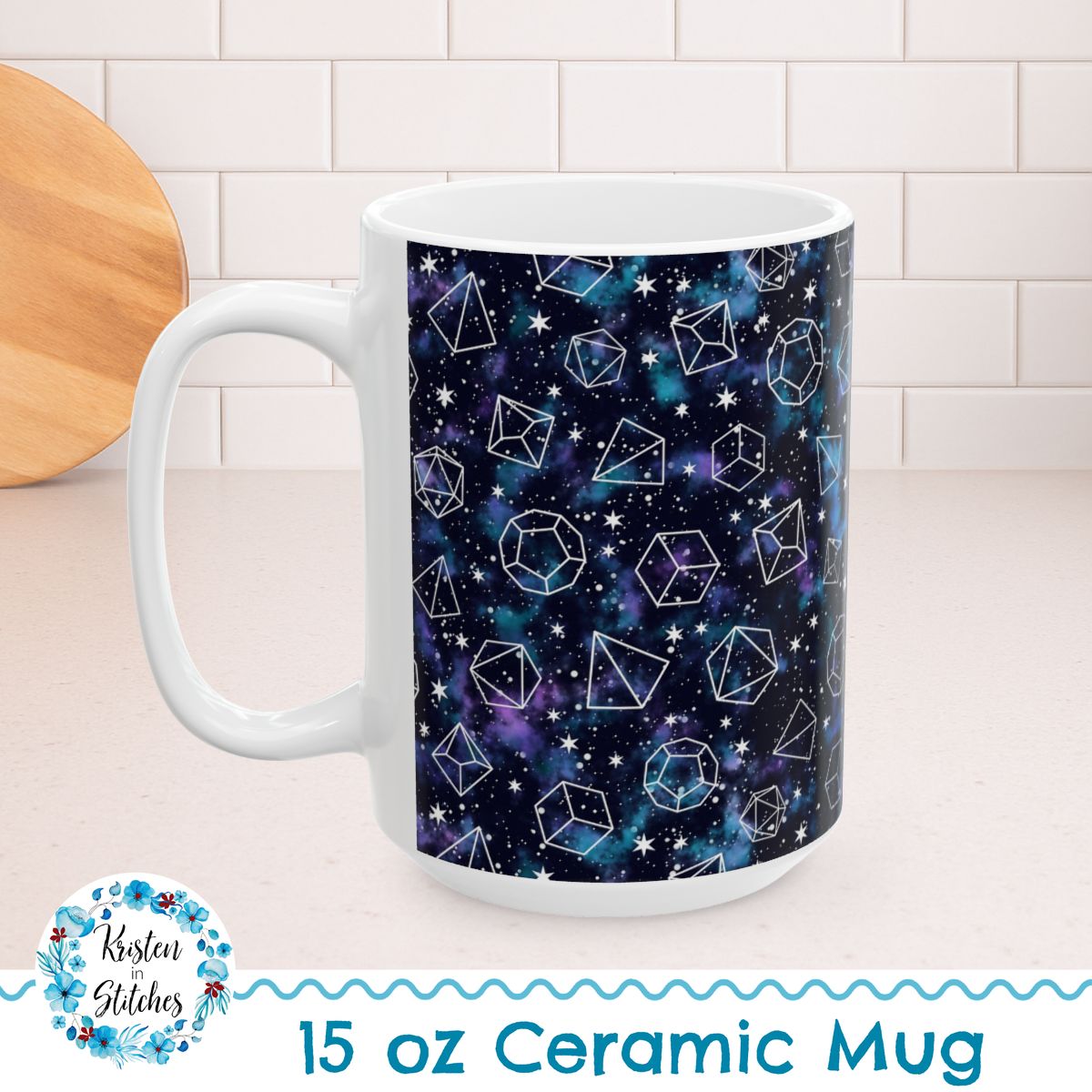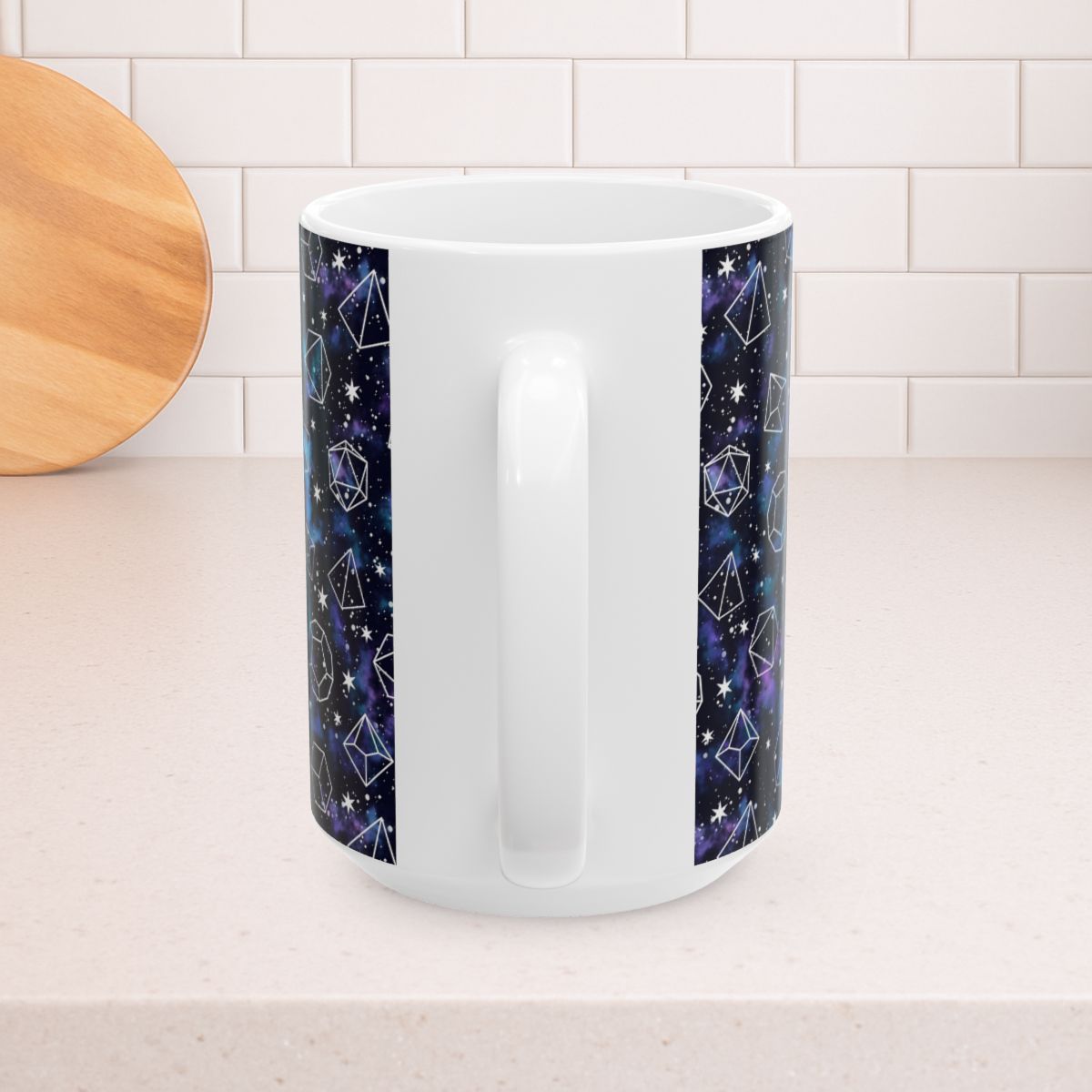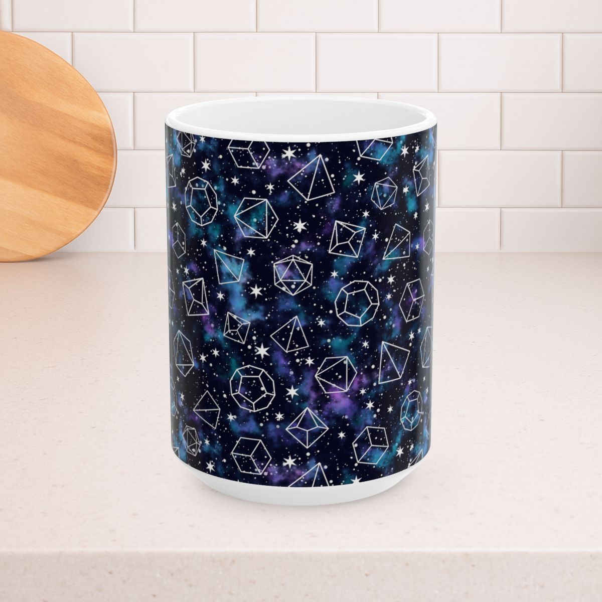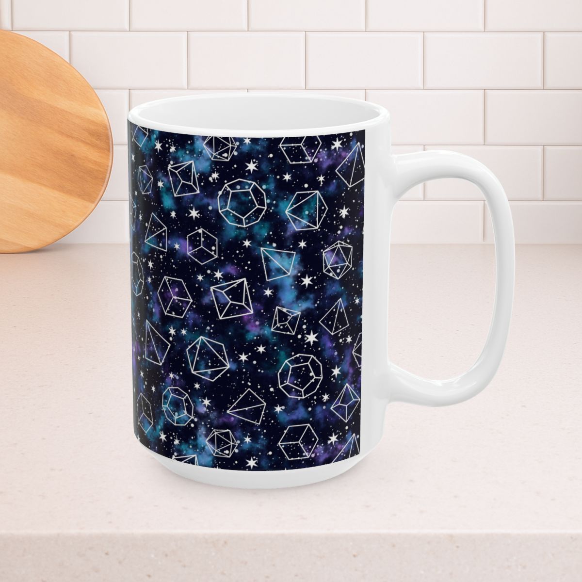 Polyhedral Space Dice 15oz Ceramic Mug, Large Coffee Cup, Fantasy DND Table Games