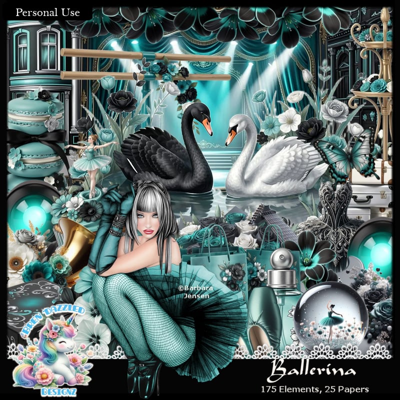 A kit about a beautiful ballerina dreaming about seeing her name up in lights. A ©Barbara Jensen tube is included with this kit, please read TOU in tubes file for instructions. This kit includes AI generated items. It has 175 elements and 25 papers in teal, black, white and silver colors.