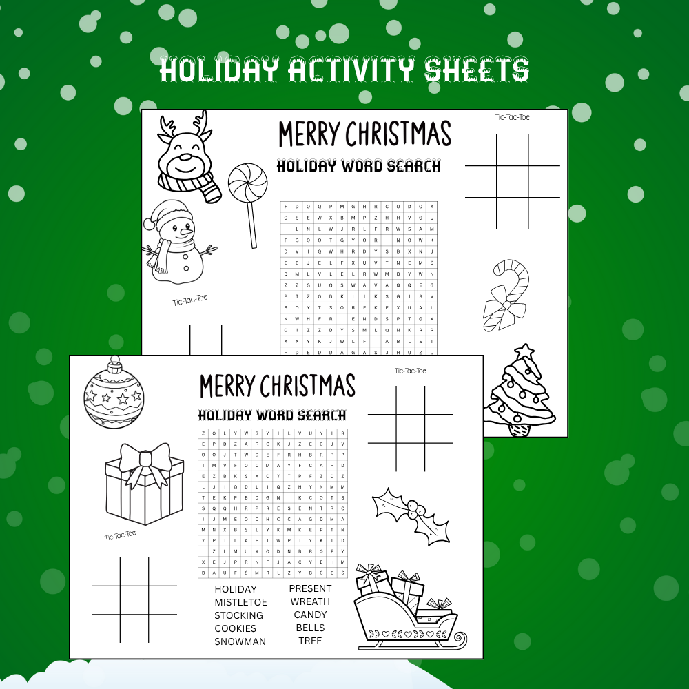 Keep the kids entertained this holiday season with these festive Freebie Holiday Activity Sheets! This downloadable set includes two 8.5 x 11 Christmas-themed activity pages packed with fun: