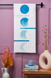 This modern applique wall quilt brings the magic of moon phases to life with four hand-appliqued blue circles, each capturing a different lunar phase. Set against a crisp white backdrop, its calming design adds a touch of celestial serenity to any space.