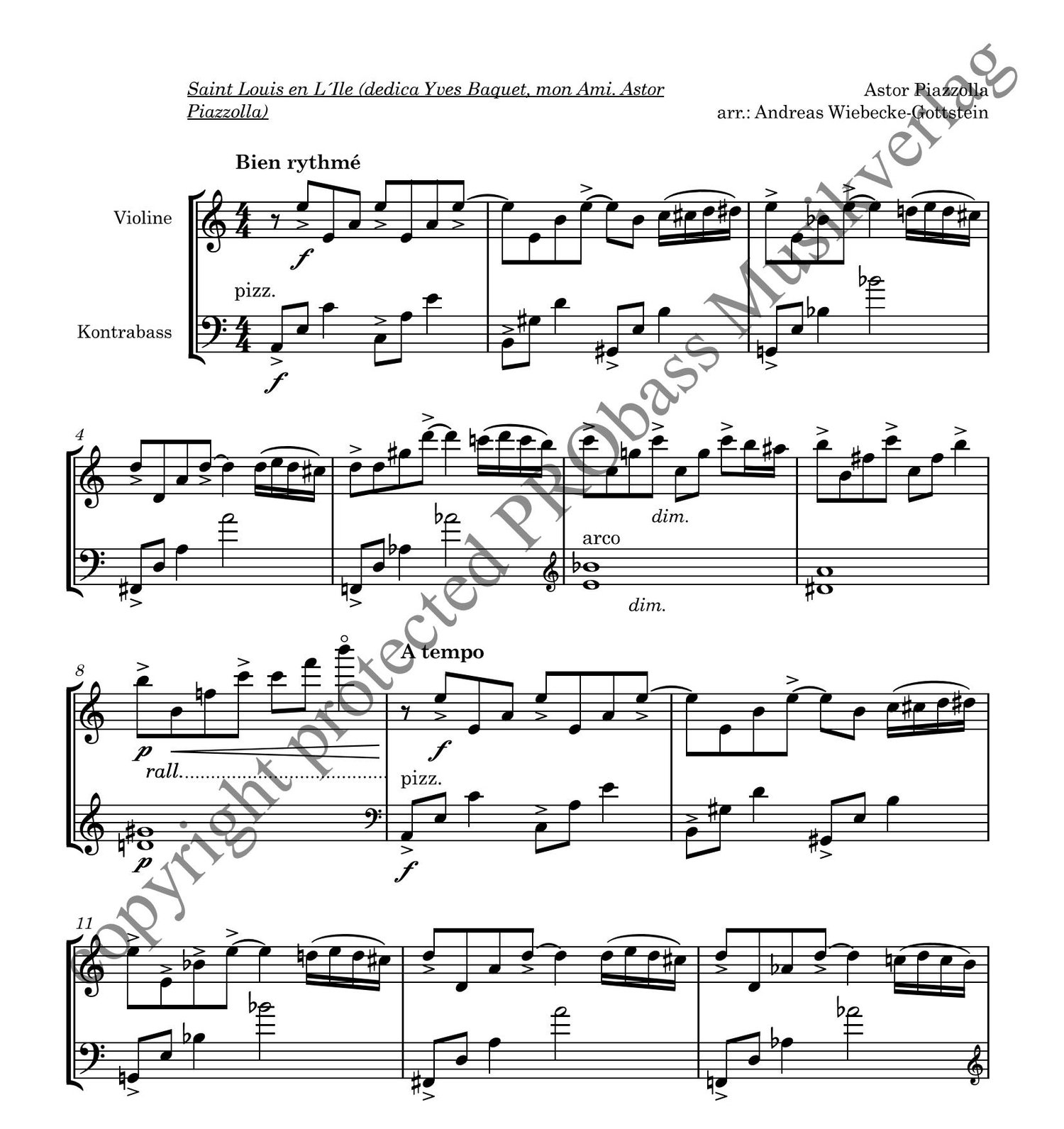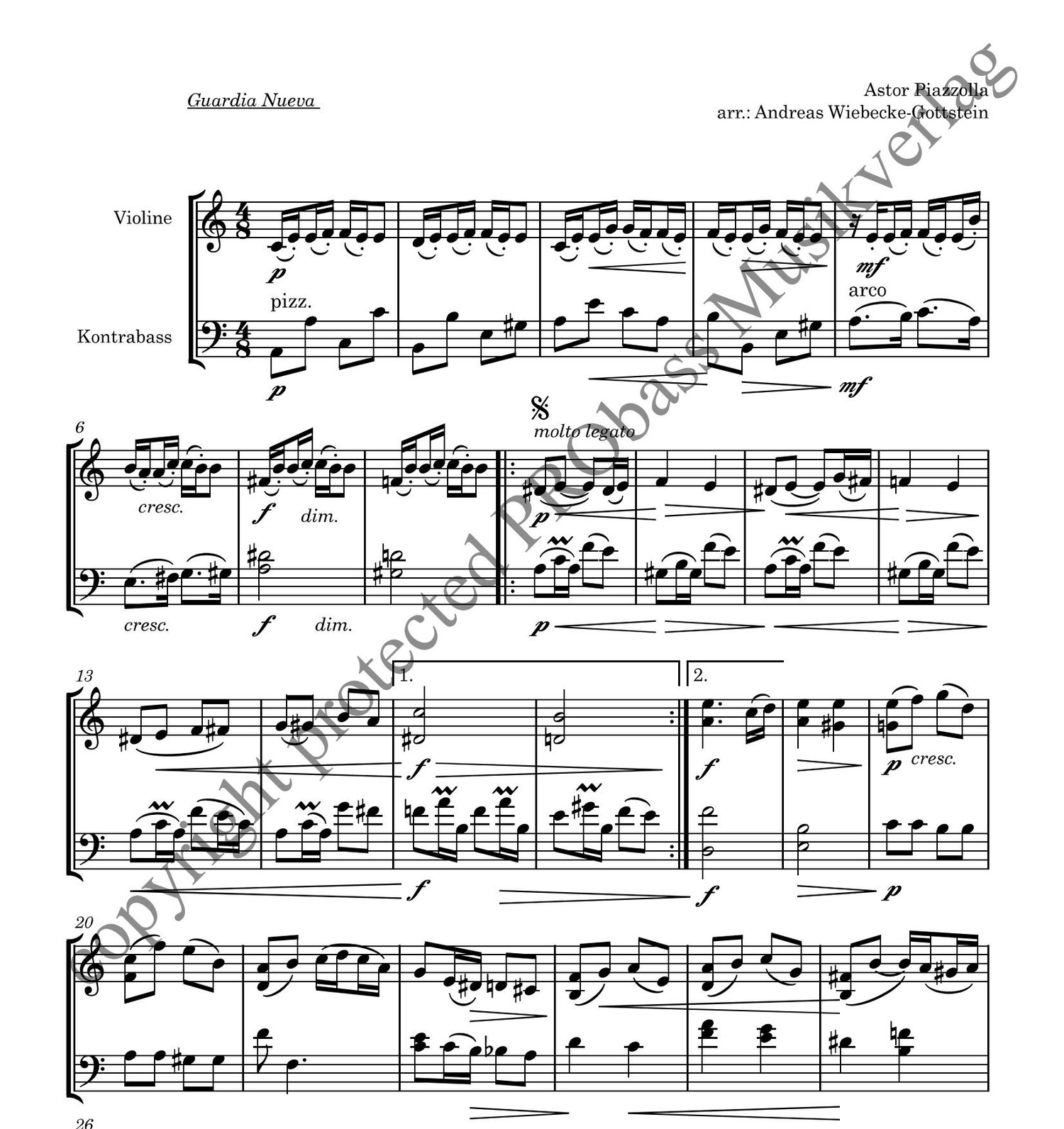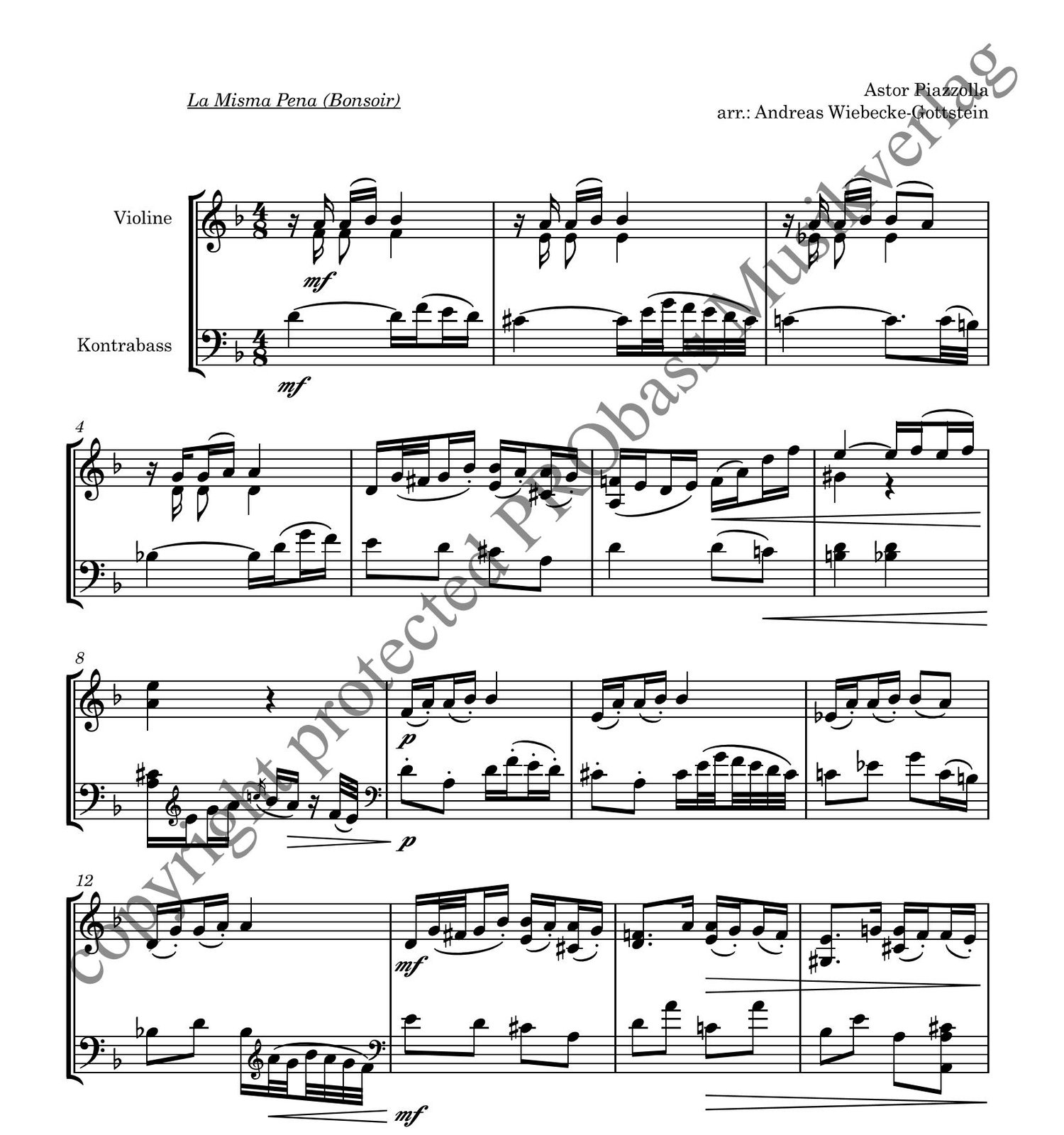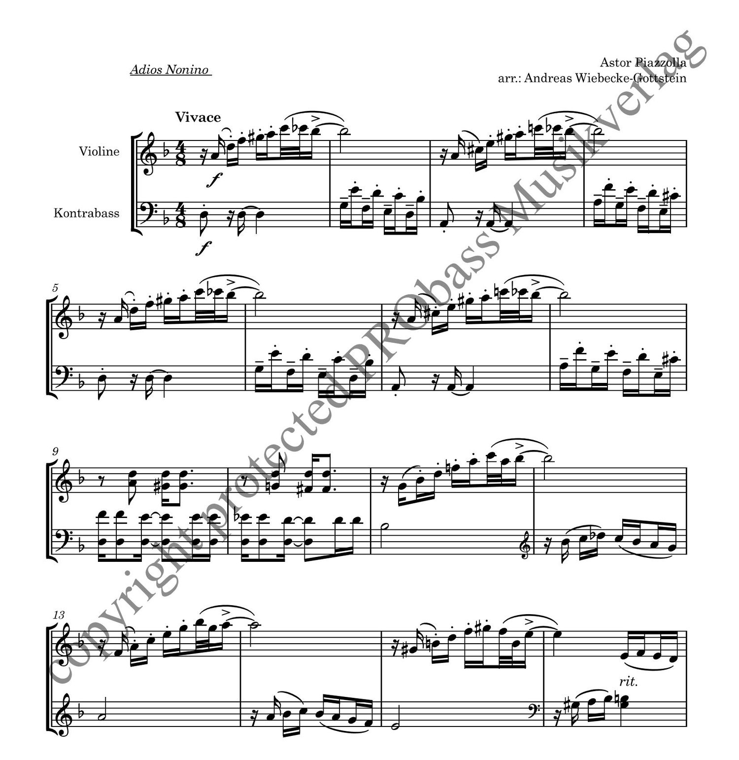 This "Tango Nuevo" by the famous tango master Piazzolla is based on the arrangement for cello and double bass (see above). Due to the extended harmonies of tango music, it was not possible to dispense with double stops in both parts in the arrangement for the duo instrumentation. However, the extra difficulty is rewarded by the very special romantic charm of this tango music.