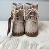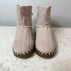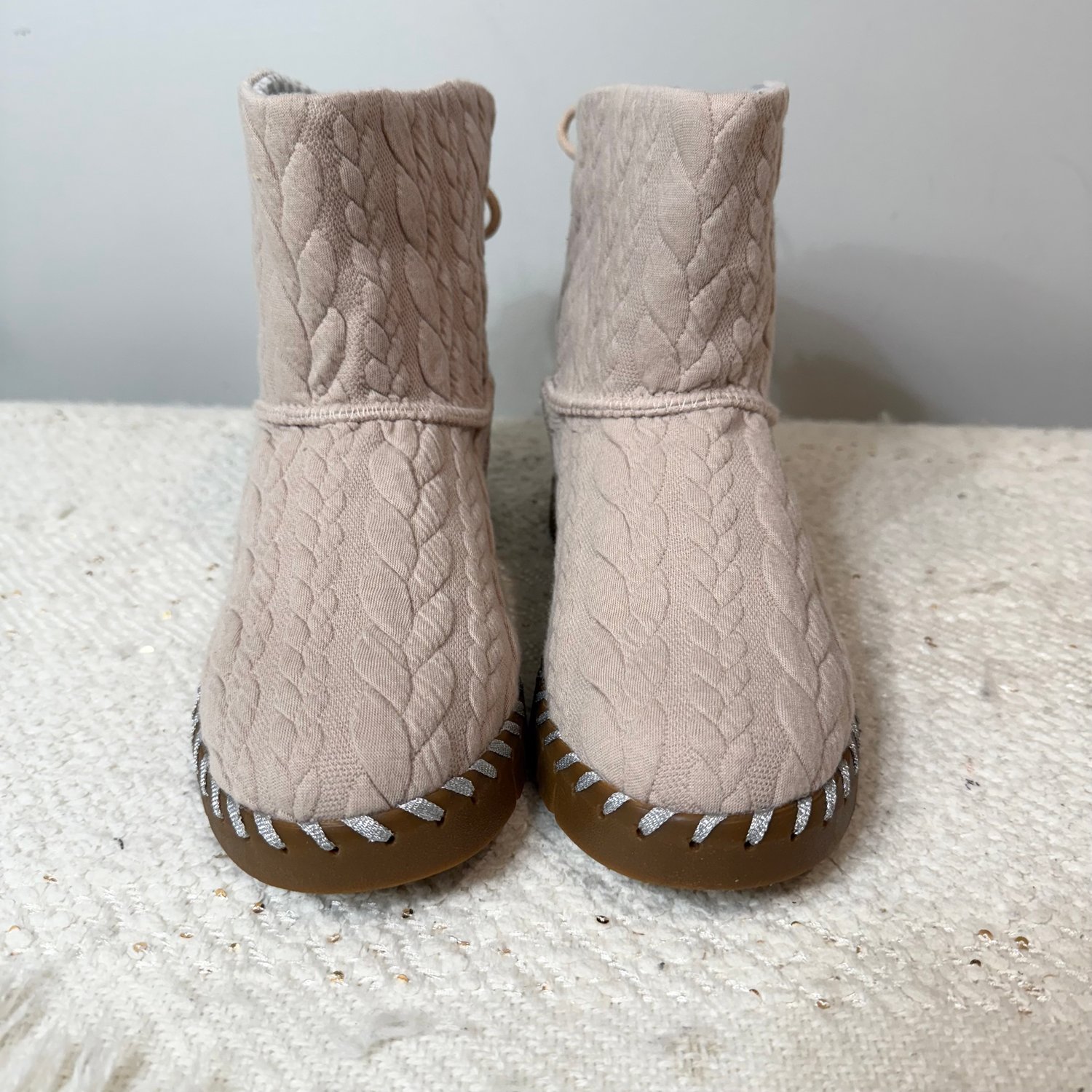 Muk Luks beige with a touch of blush pink cable knit fabric pull on boots with memory foam insoles and back tie details.