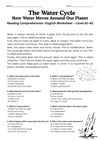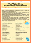 The short, clear text explains the water cycle in simple language, followed by 8 multiple-choice questions to check understanding.