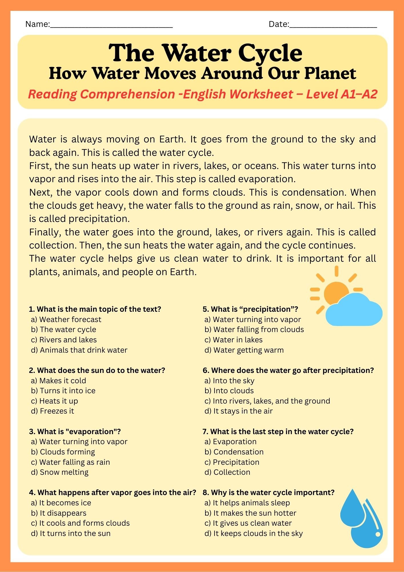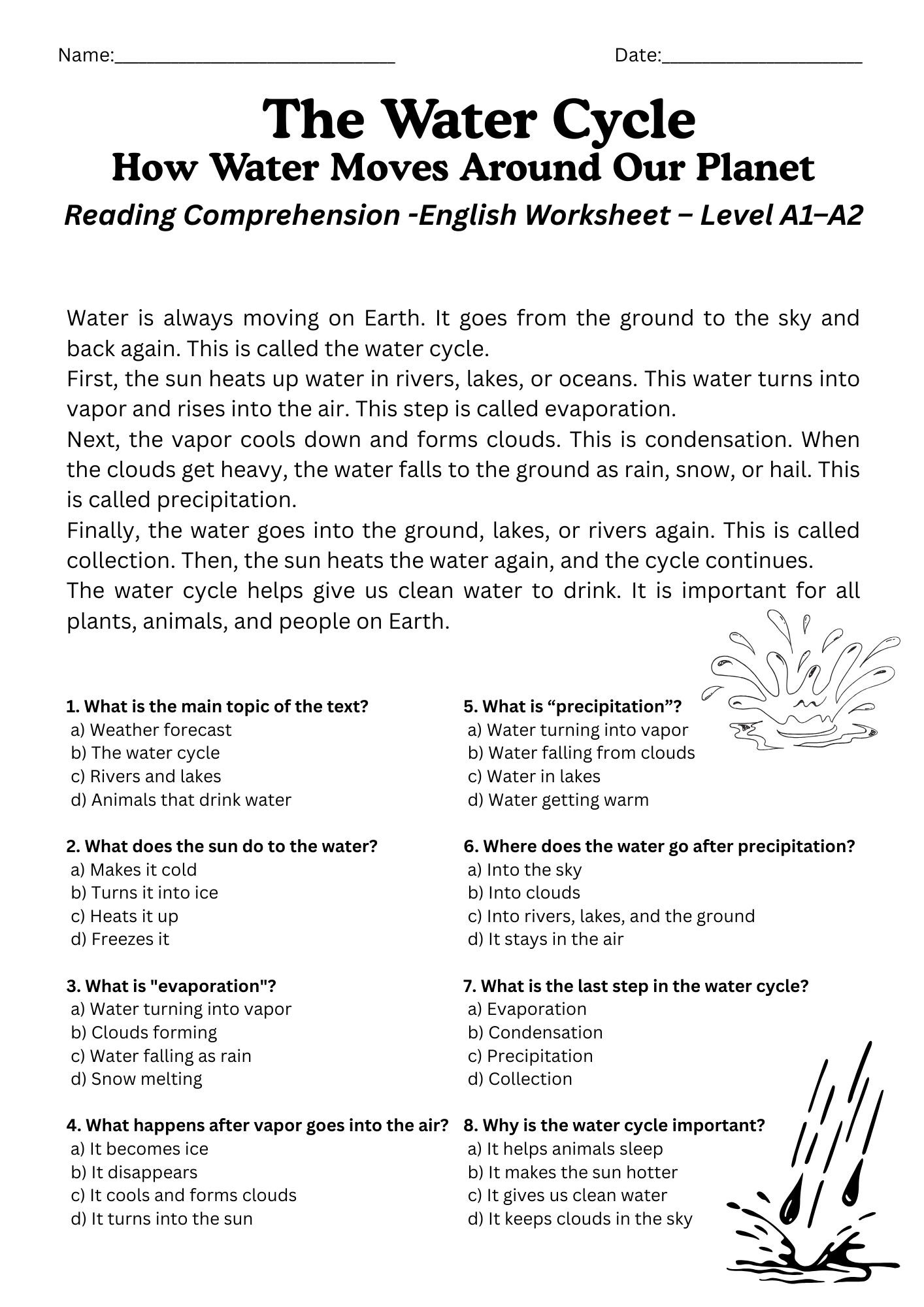 The Water Cycle – Reading Comprehension Worksheet (A1–A2 Level)
