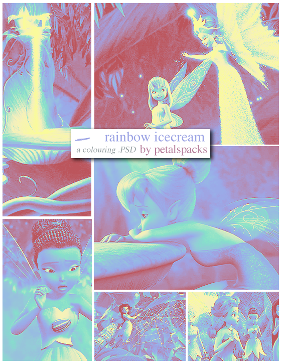 minimal base editing (smart sharpening) has been used on these images. it creates a semi-rainbow gradient inspired by my favourite childhood treat; the australian rainbow paddle pop icecream. oftentimes my .psds colourise best media of similar lighting / aesthetics; the example images are included for reference.