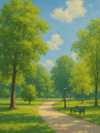This inviting artwork perfectly captures the bright, refreshing beauty of a summer park, rendered in a soft, slightly textured painting style. A gentle, curved dirt path leads the eye deep into the scene, flanked by tall, majestic trees covered in vibrant, lush lime-green foliage. The composition is open and airy, with a bright blue sky dotted with soft, puffy white clouds overhead. In the middle ground, a traditional black lamppost and a peaceful green park bench sit beside the path, inviting the viewer to pause and enjoy the quiet atmosphere. The lighting is sunny and diffused, highlighting the emerald green of the well-kept lawn and evoking a feeling of profound calm, ease, and simple pleasure found in nature.